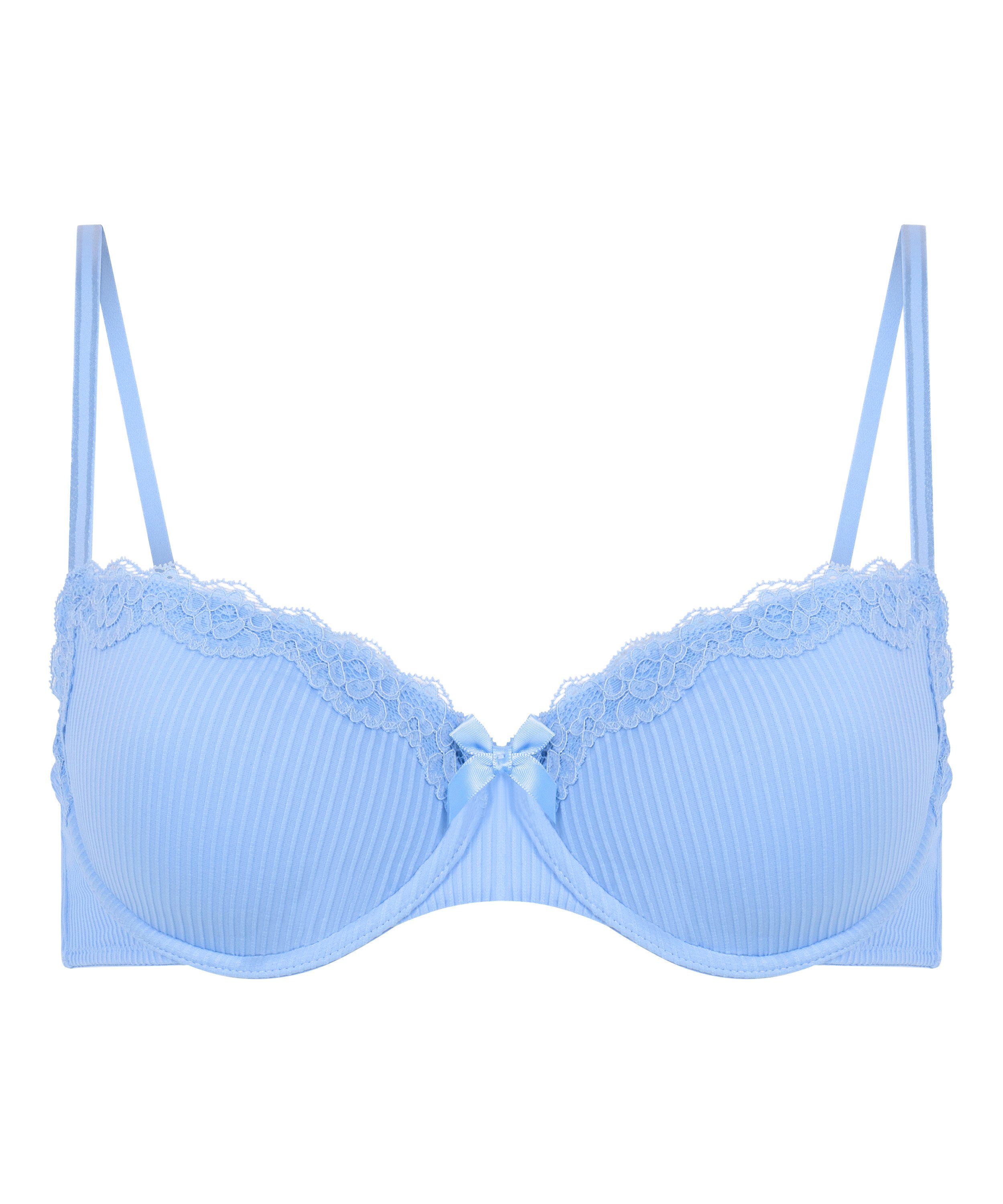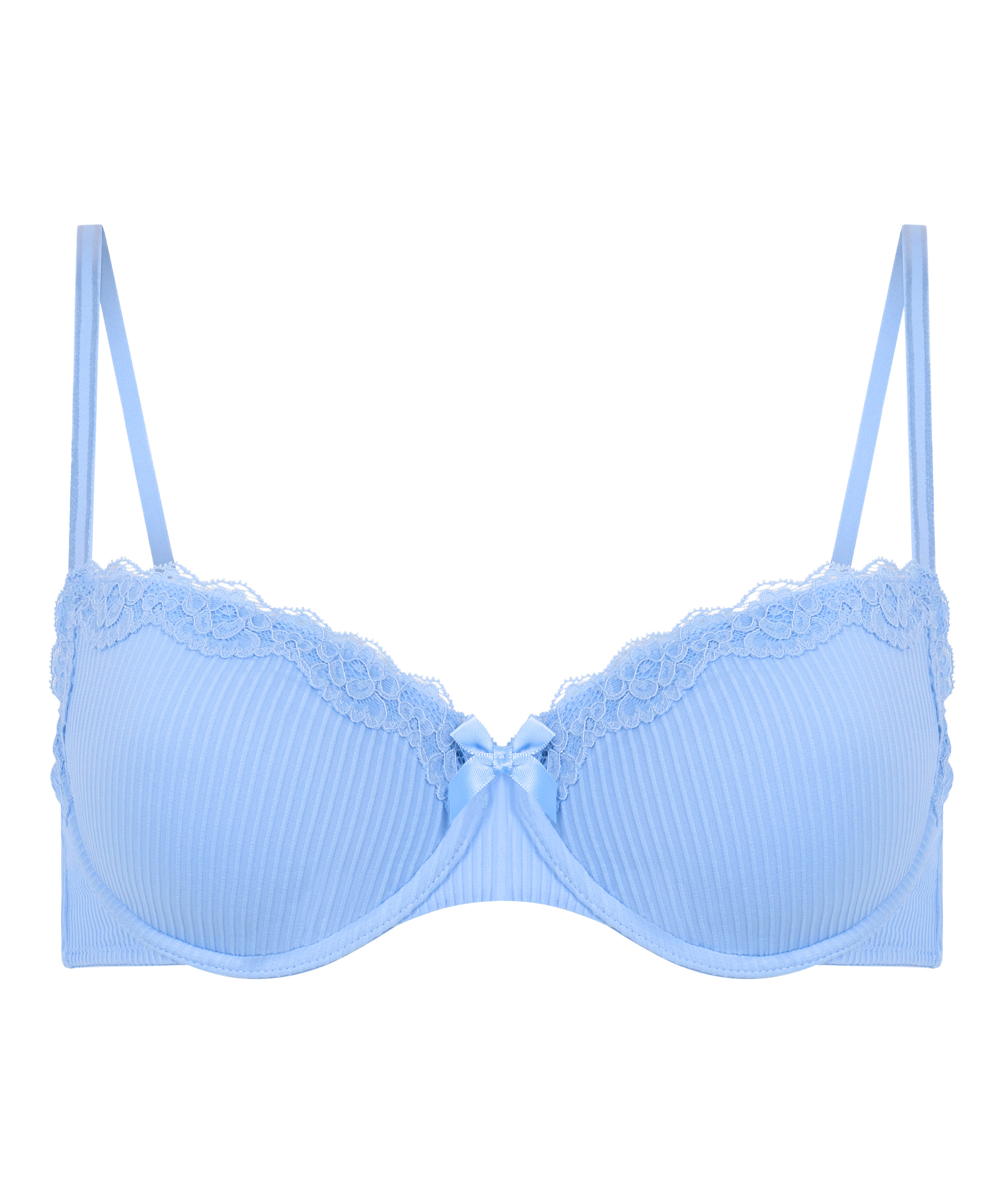 Este sujetador con aros acolchado está acabado con detalles de encaje en la parte superior de las copas. También tiene un pequeño lazo entre las copas, lo que le da un look supersexi. ¡Combínalo con los artículos a juego!