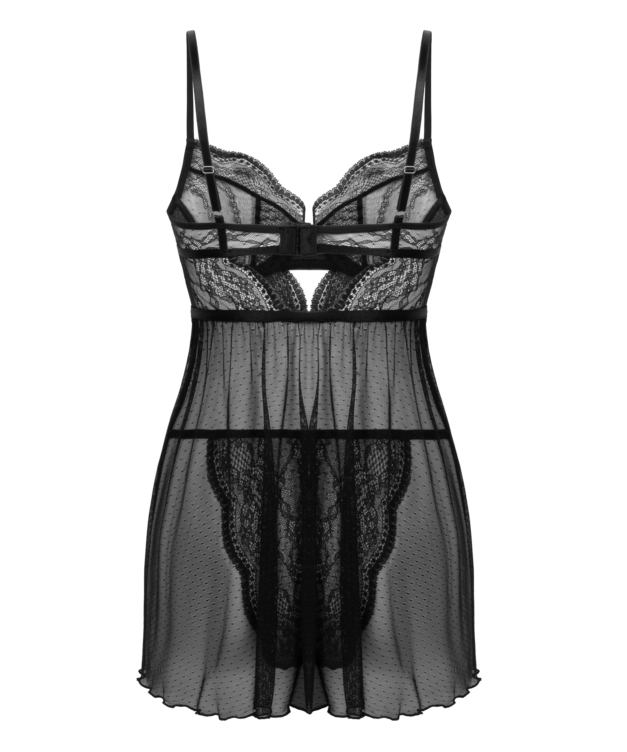 Siéntete sexi en este precioso picardías. Cuenta con un romántico diseño de encaje en toda la prenda y con un sistema de sujeción en la parte delantera y en la espalda, así como con aros en las copas. ¡Lúcelo a conjunto con las braguitas brasileñas a juego!