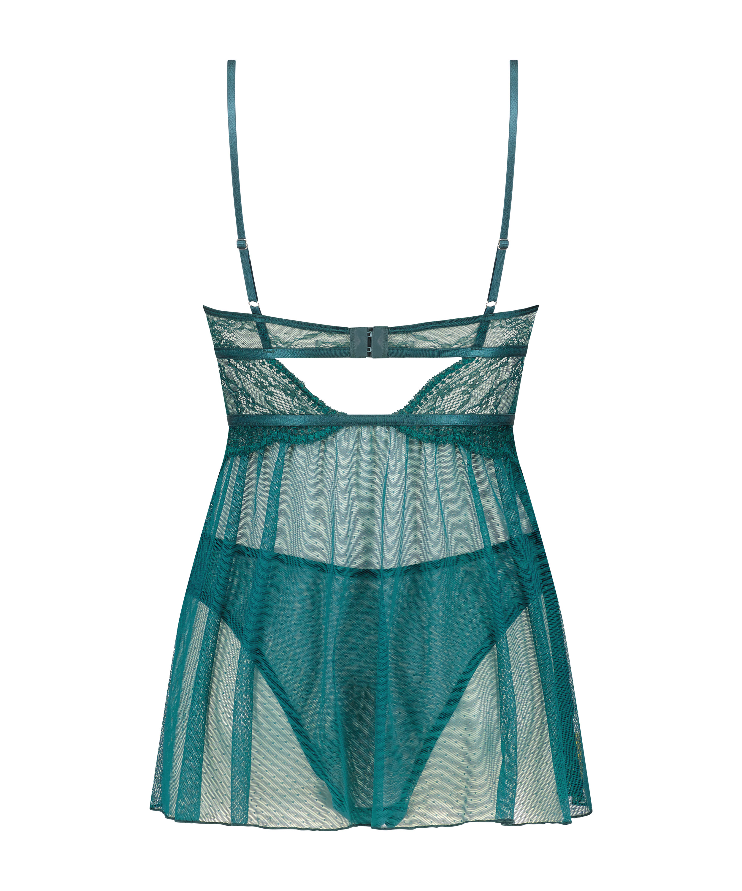 Siéntete sexi en este precioso picardías. Cuenta con un romántico diseño de encaje en toda la prenda y con un sistema de sujeción en la parte delantera y en la espalda, así como con aros en las copas. ¡Lúcelo a conjunto con las braguitas brasileñas a juego!