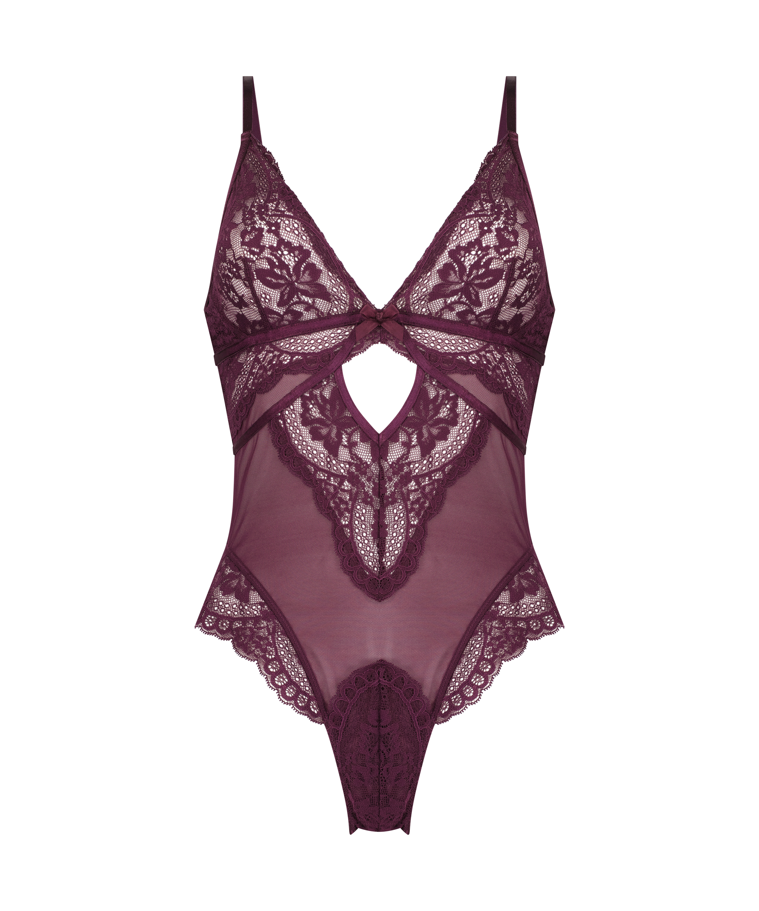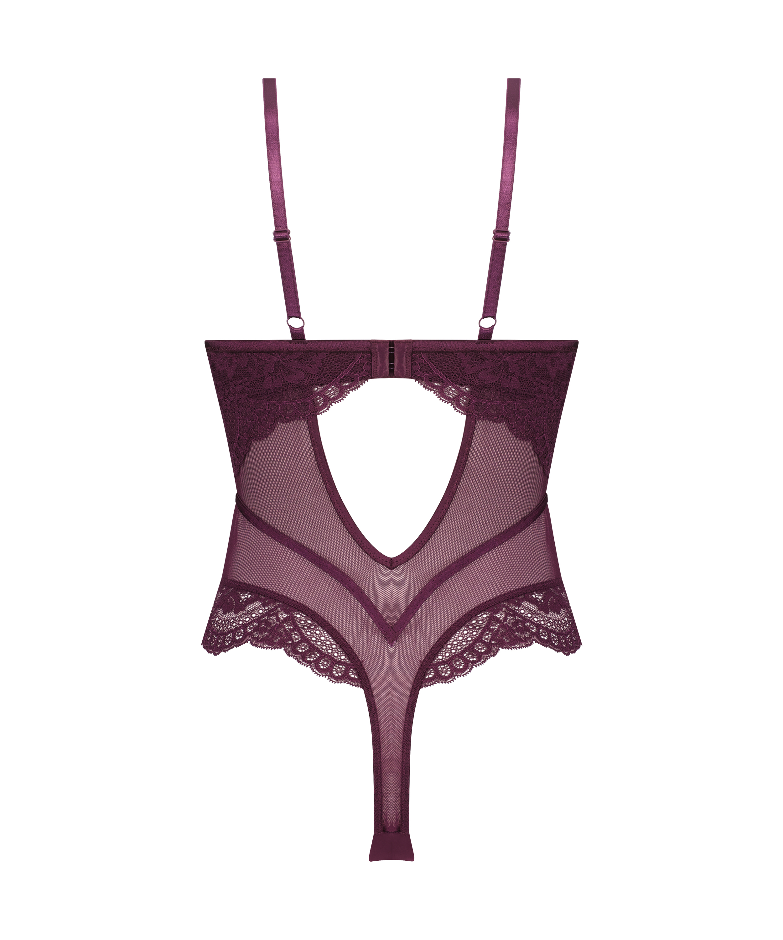 ¡Luce tipazo con este bodi! Tiene encaje, rejilla y un bonito lazo en la parte delantera. Además, los tirantes son ajustables y el bodi es semitransparente.