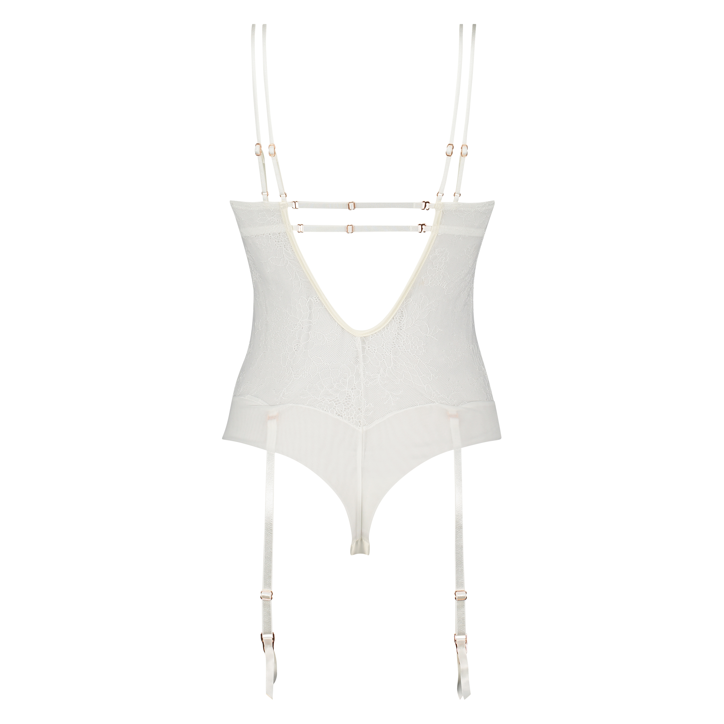 Siéntete seductora con este bodi Está hecho íntegramente de encaje con detalles de rejilla. Los tirantes en la parte inferior son extraíbles. Combínalo con unas medias a juego, ¡y consigue un look irresistible! Forma parte de la colección Noir.
