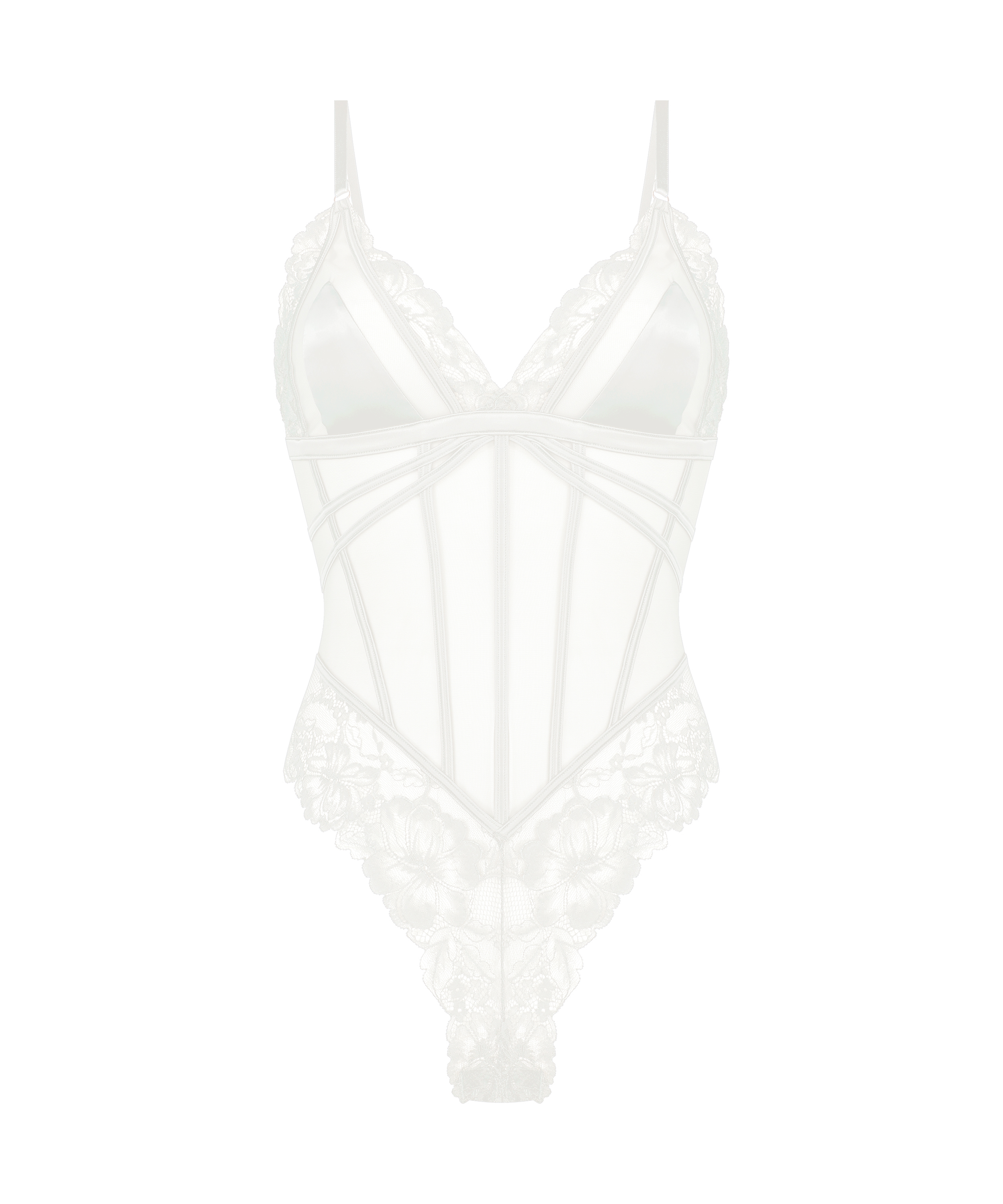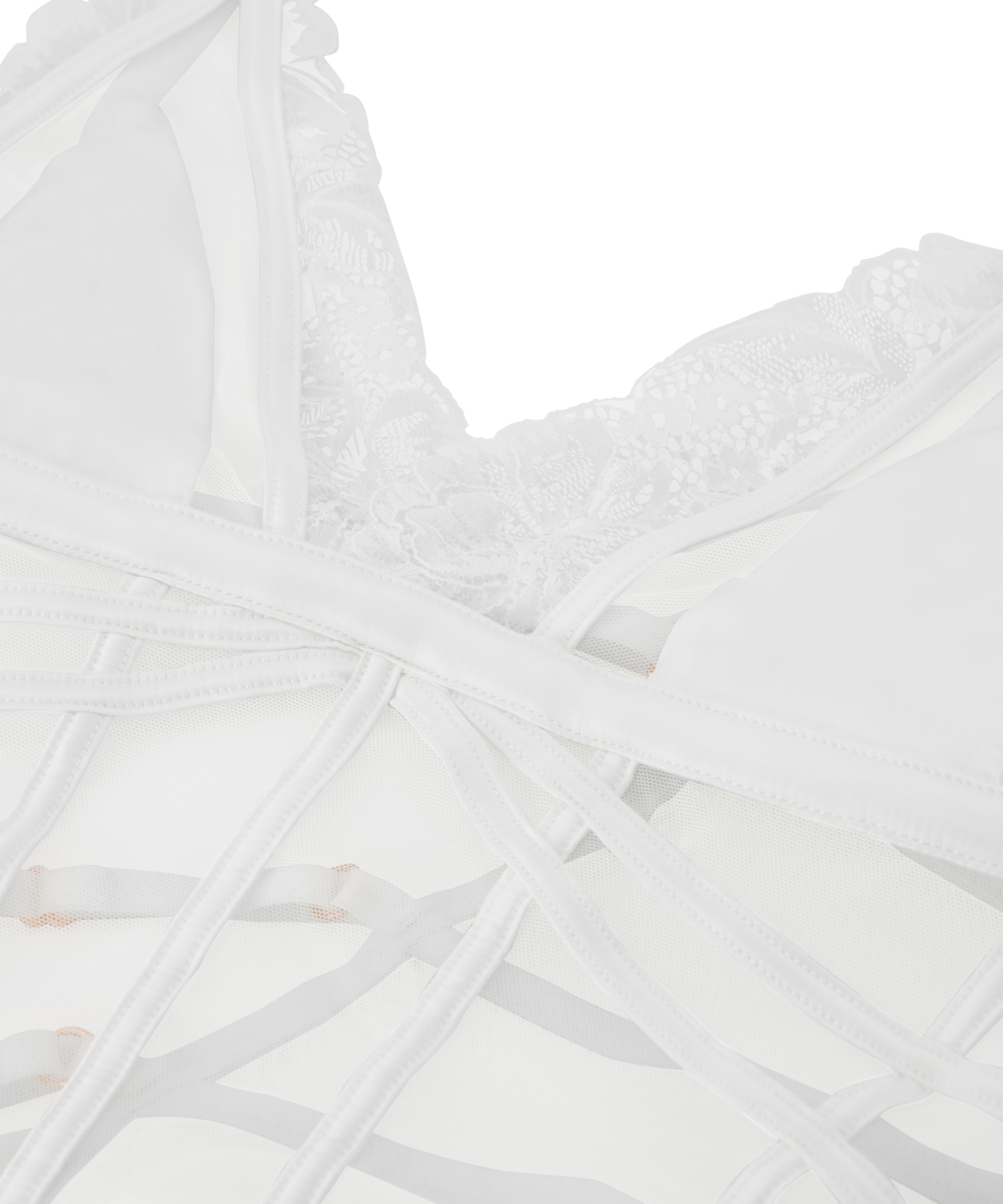 ¡Siéntete cómoda con este bodi! El bodi no tiene relleno y tiene una bonita espalda semiabierta. Hay muchos detalles de encaje en la parte delantera y trasera, combinados con esqueleto frontal para un ajuste de apoyo. Combina este bodi con artículos de la Colección Noir.