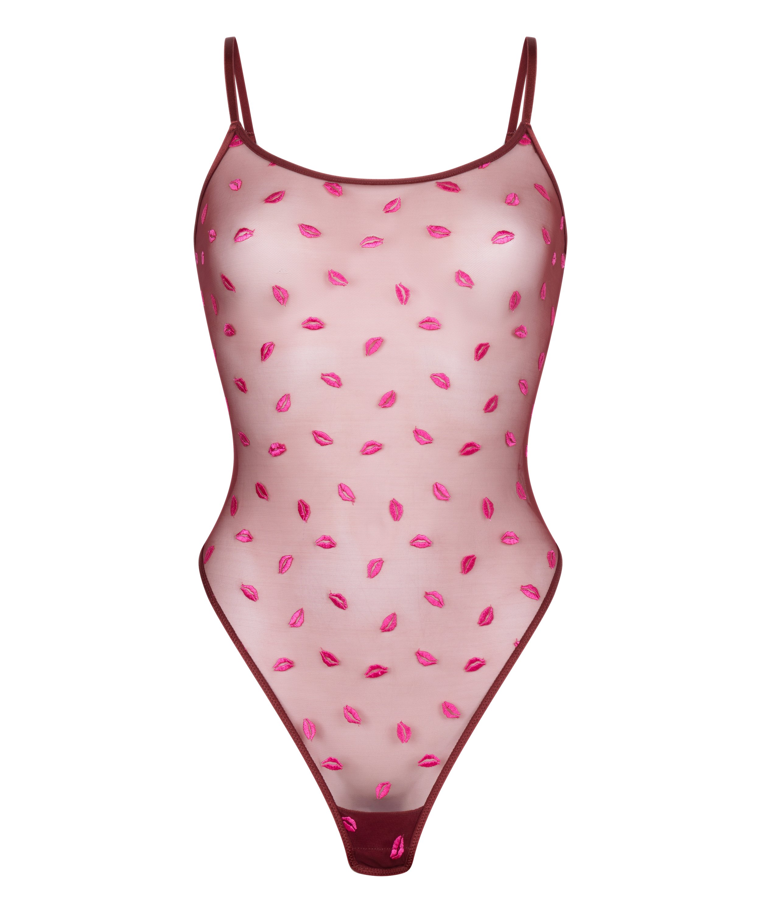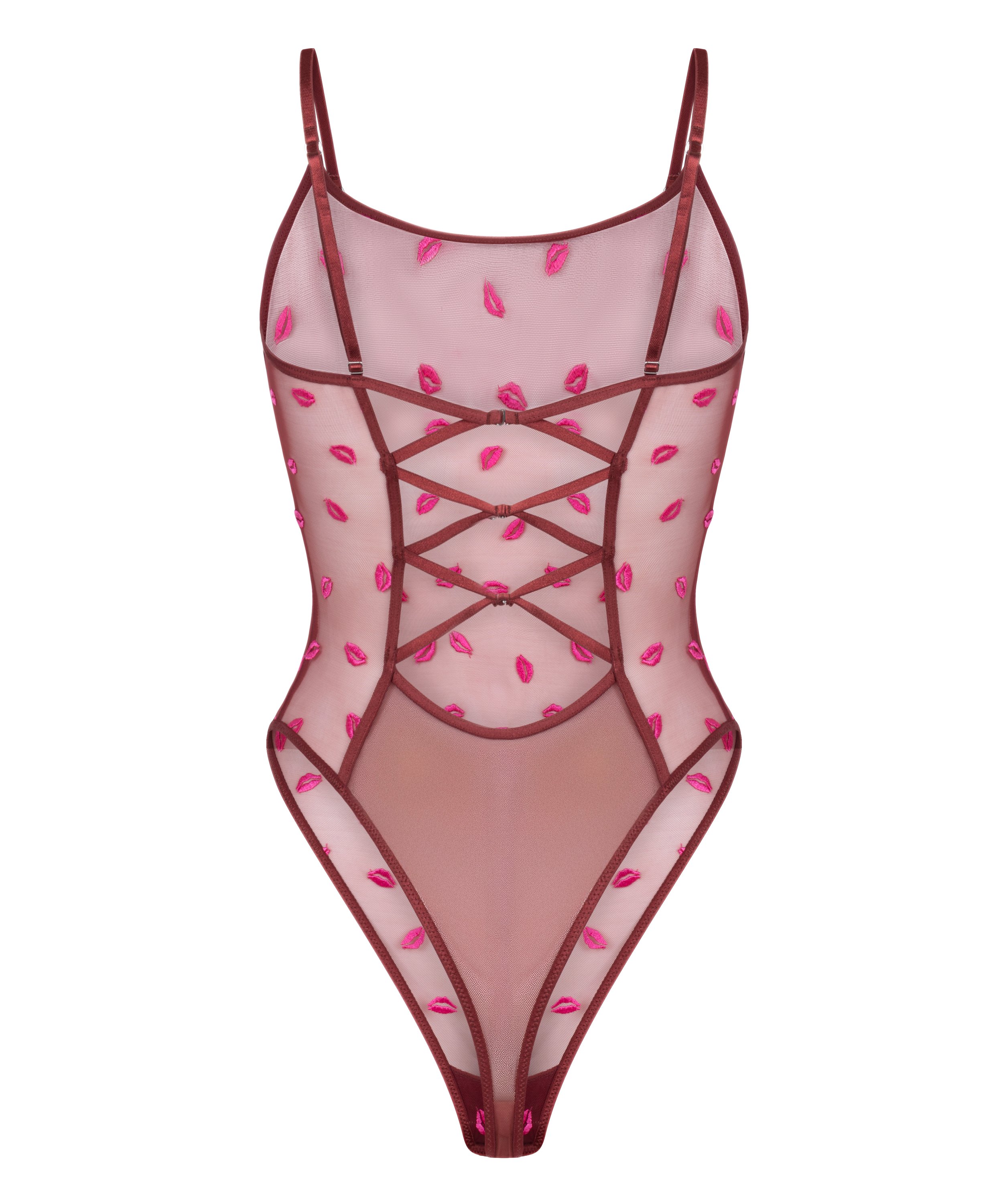 Luce irresistible con este bodi de malla transparente, diseñado para un look atrevido y romántico. Su espalda abierta con detalles cruzados crea una silueta imponente. Adornada con juguetones bordados de besos, esta pieza combina la coqueta elegancia con el estilo de tendencia. ¡Añádela a tu armario y eleva tus conjuntos!