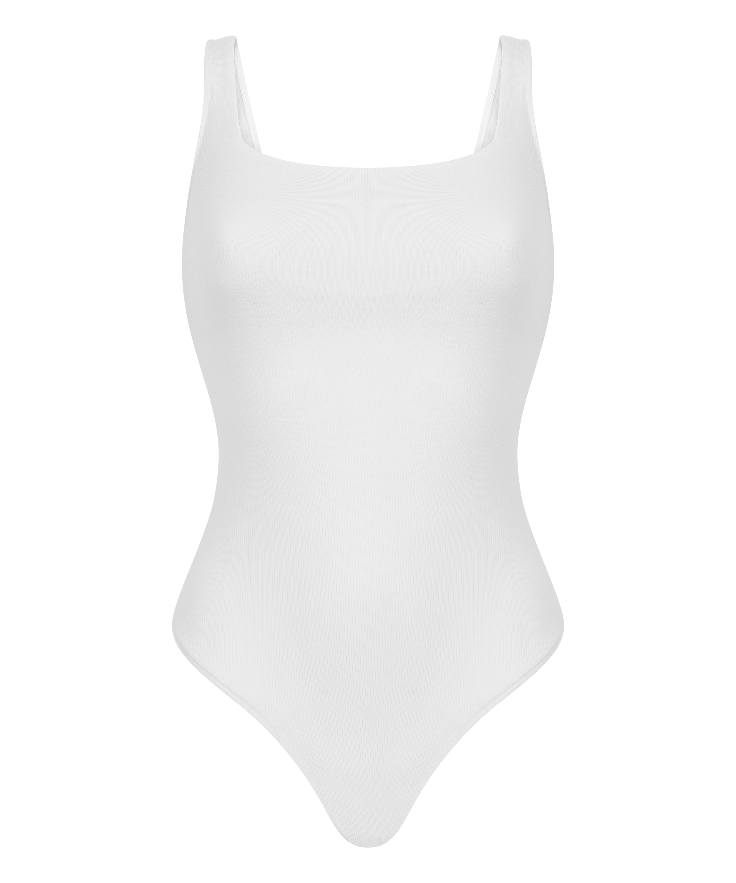 Body de algodón hecho de material suave y acanalado con tirantes anchos para mayor sujeción y una capa extra de tejido en la zona del pecho. La parte posterior presenta un amplio diseño en forma de V y estilo tanga.