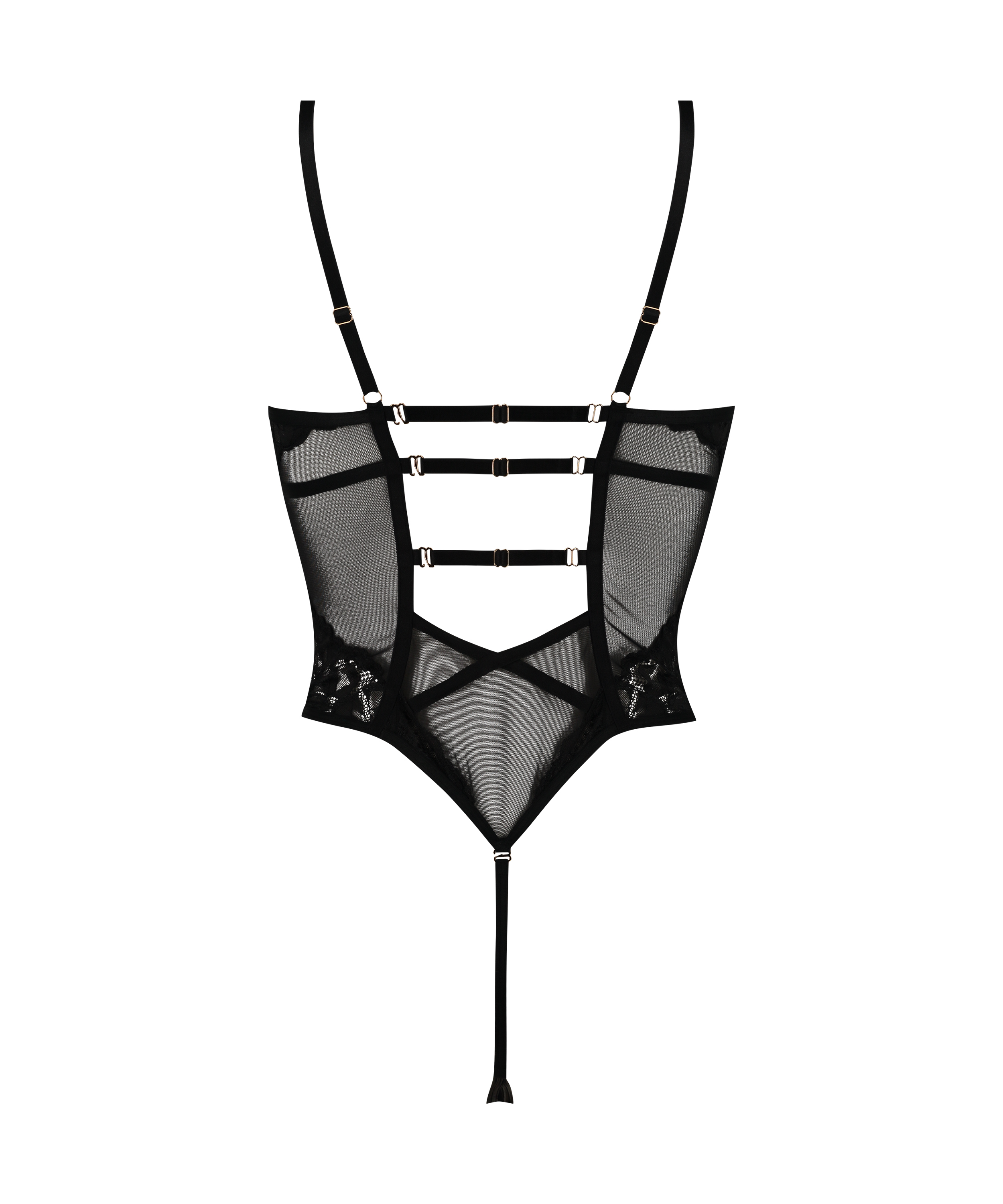 ¡Con este impresionante body añadirás una chispa de picante a tu armario!Su diseño con aros realza tu silueta donde tiene que hacerlo. Sus singulares adornos, como copas brillantes con apariencia de látex y los intrincados detalles de encaje, crean un atractivo visual exquisito que no pasará desapercibido. Forma parte de la colección Private.