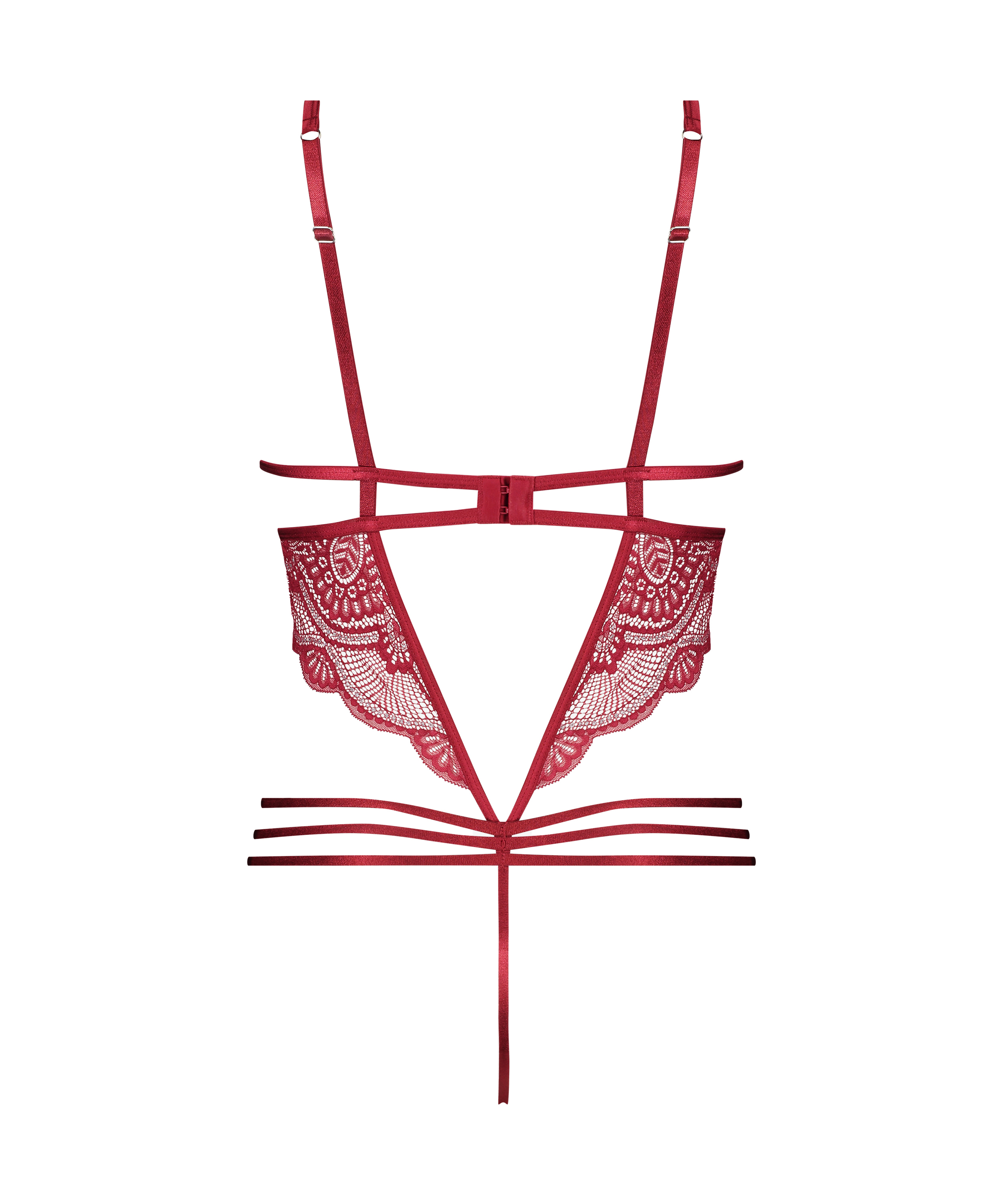 Body confeccionado en encaje en combinación con tela de satén. Cuenta con un aro en las copas y lo que destaca de esta prenda son sus detalles extra de cordeles. Pertenece a la Colección Privada.