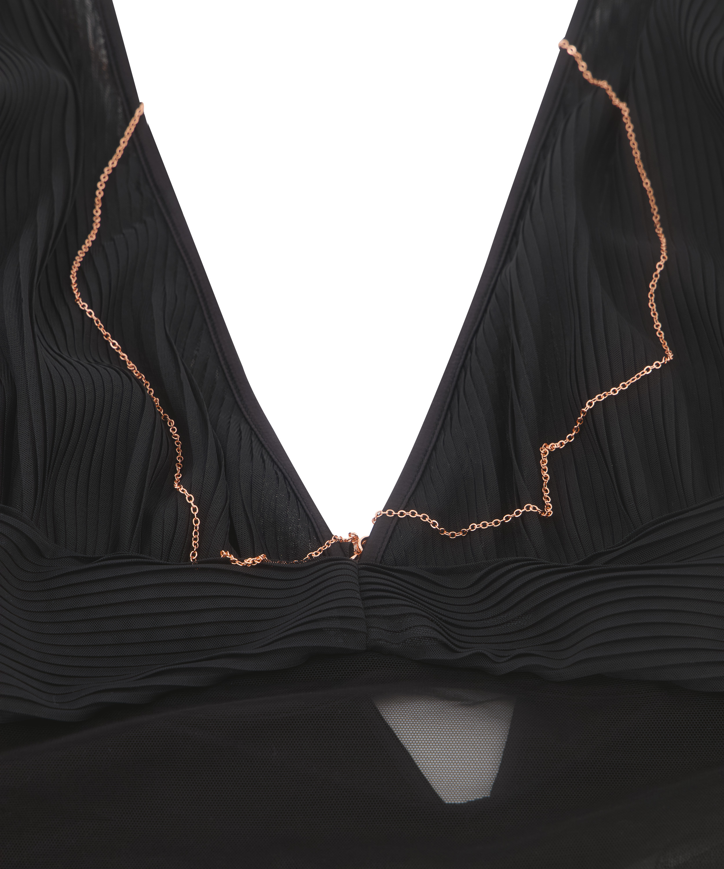 Disfruta de una elegancia sensual con nuestro body Simona. Con un diseño escotado perfecto adornado con una cadena desmontable, esta pieza irradia sofisticación y encanto. La profunda espalda en V y su práctico clip de cierre añaden un toque extra de glamour. Impulsa tu colección de lencería con este seductor y lujoso body.