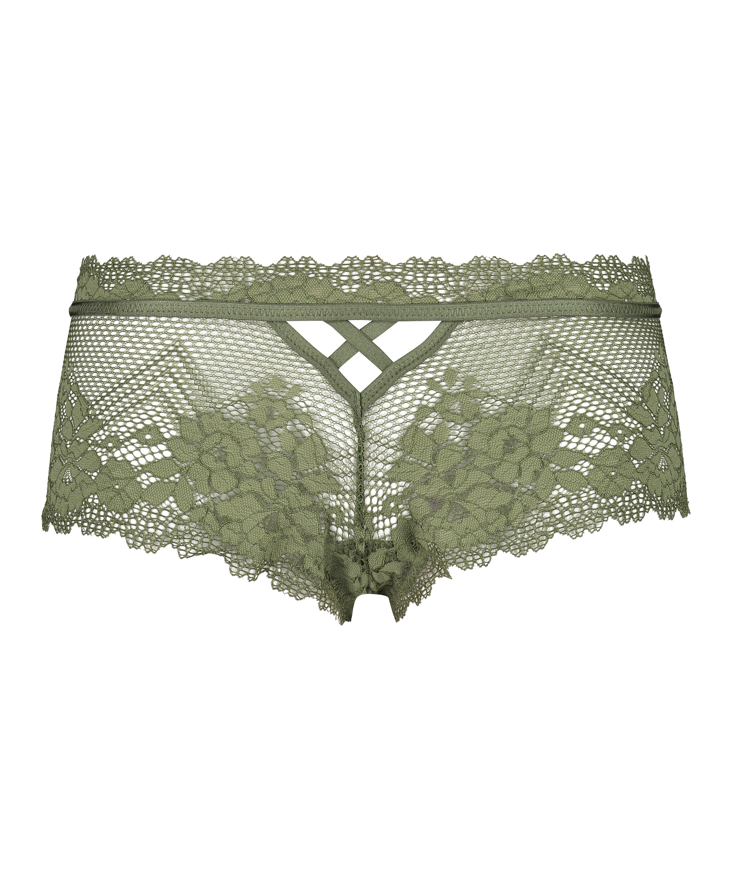 ¡Este bóxer no debe faltar en tu armario! Está completamente hecha de encaje. Tiene detalles de aberturas en la parte delantera. ¡Combínalo con el sujetador a juego para completar tu conjunto!