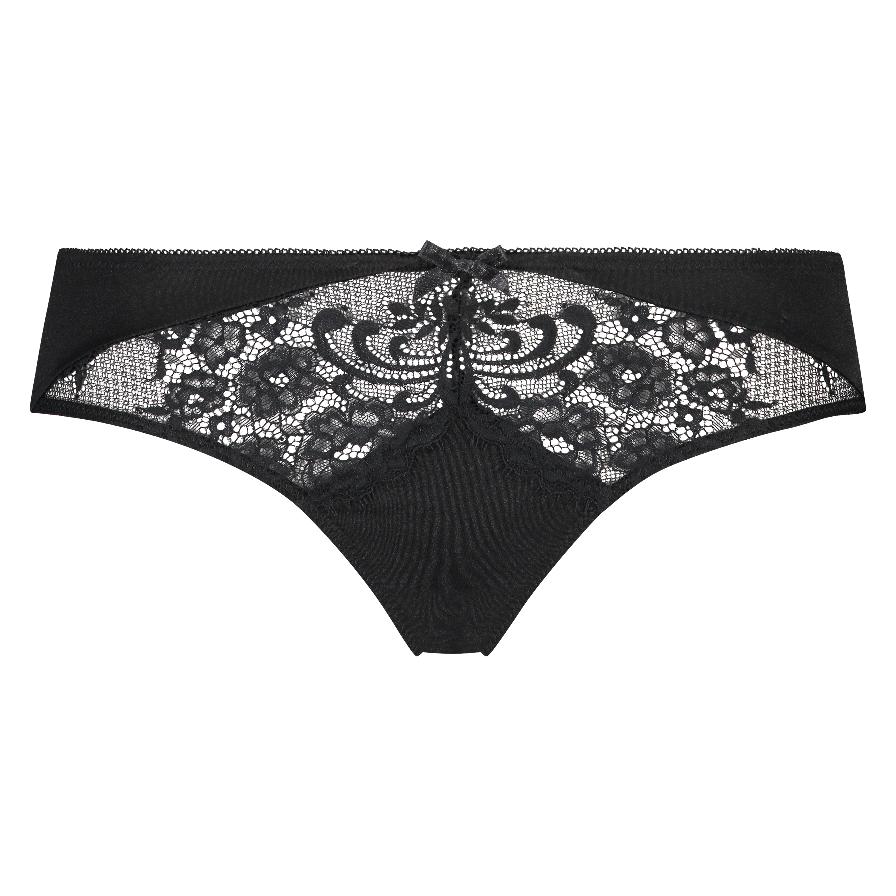 Esta braguita brasileña está hecha de una mezcla de encaje y microtejido. La parte trasera está hecha íntegramente de encaje. ¡El lacito en la parte delantera le da un bonito toque final!