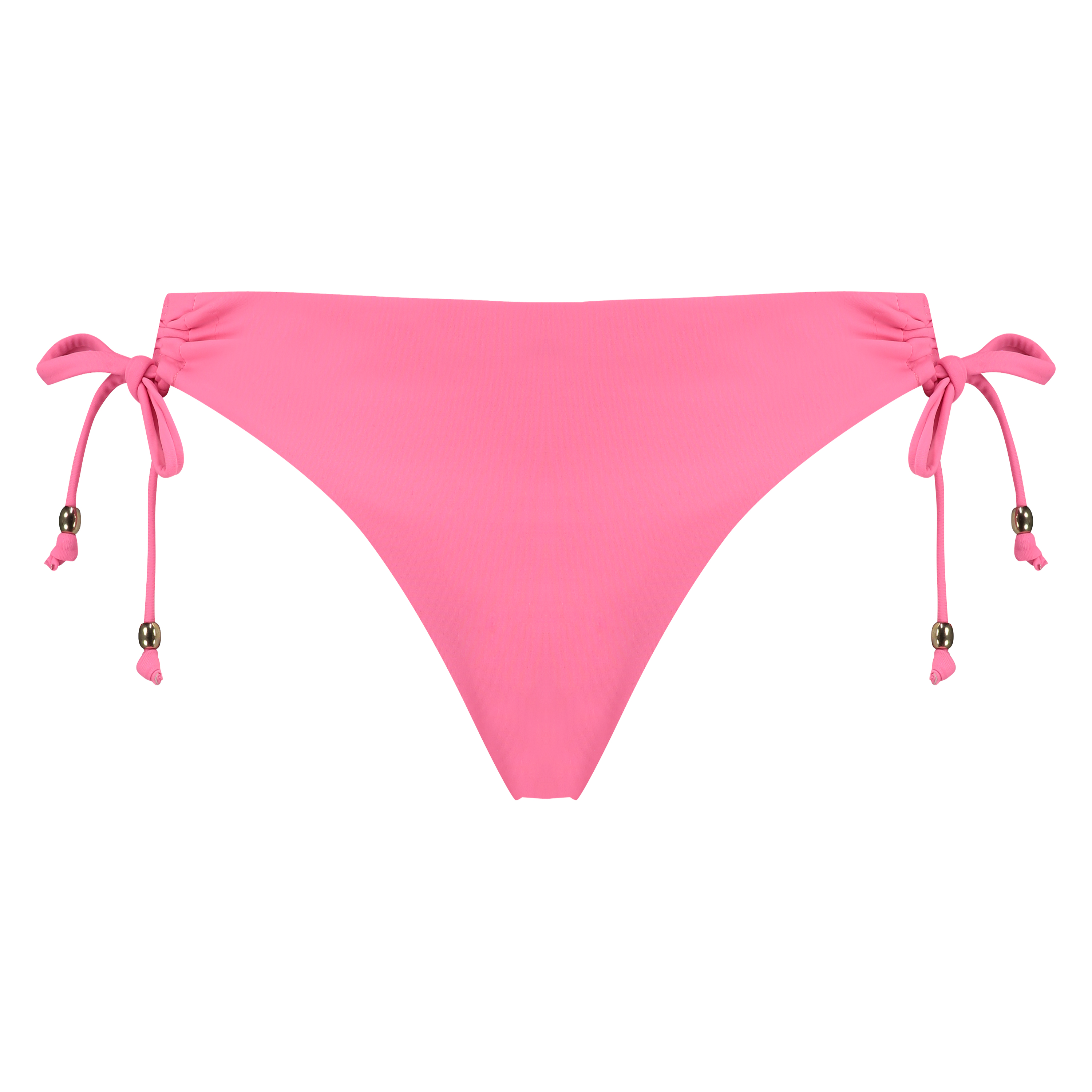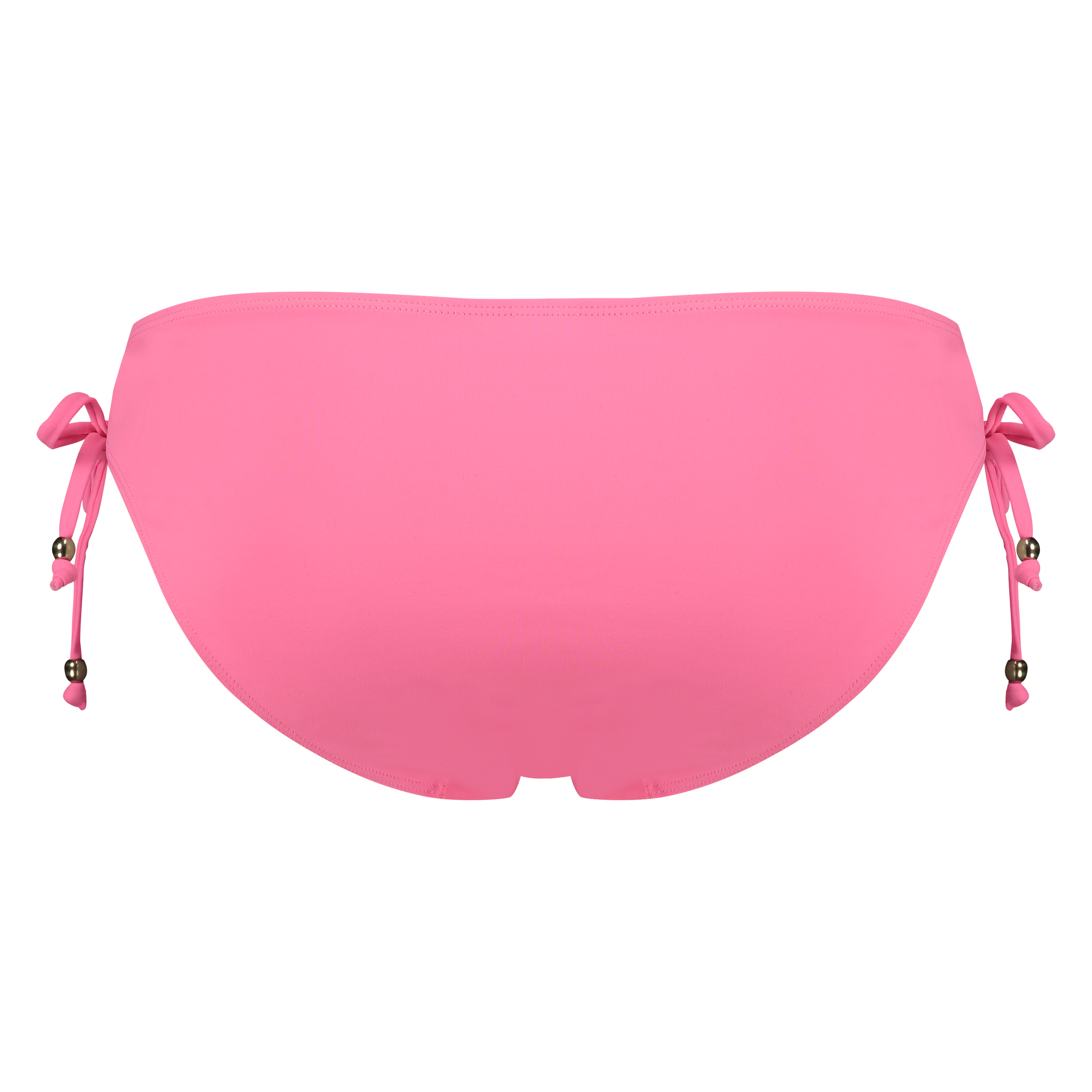Esta braguita de bikini puede anudarse con lacitos en ambas caderas. Estos lacitos tienen un acabado de abalorios en los extremos.