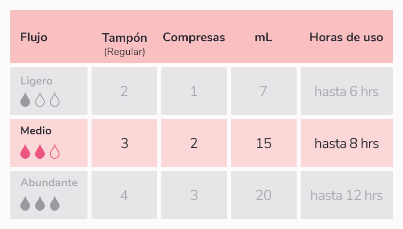 - ● Medio: 3 tampones al día (hasta 8 horas de absorción)