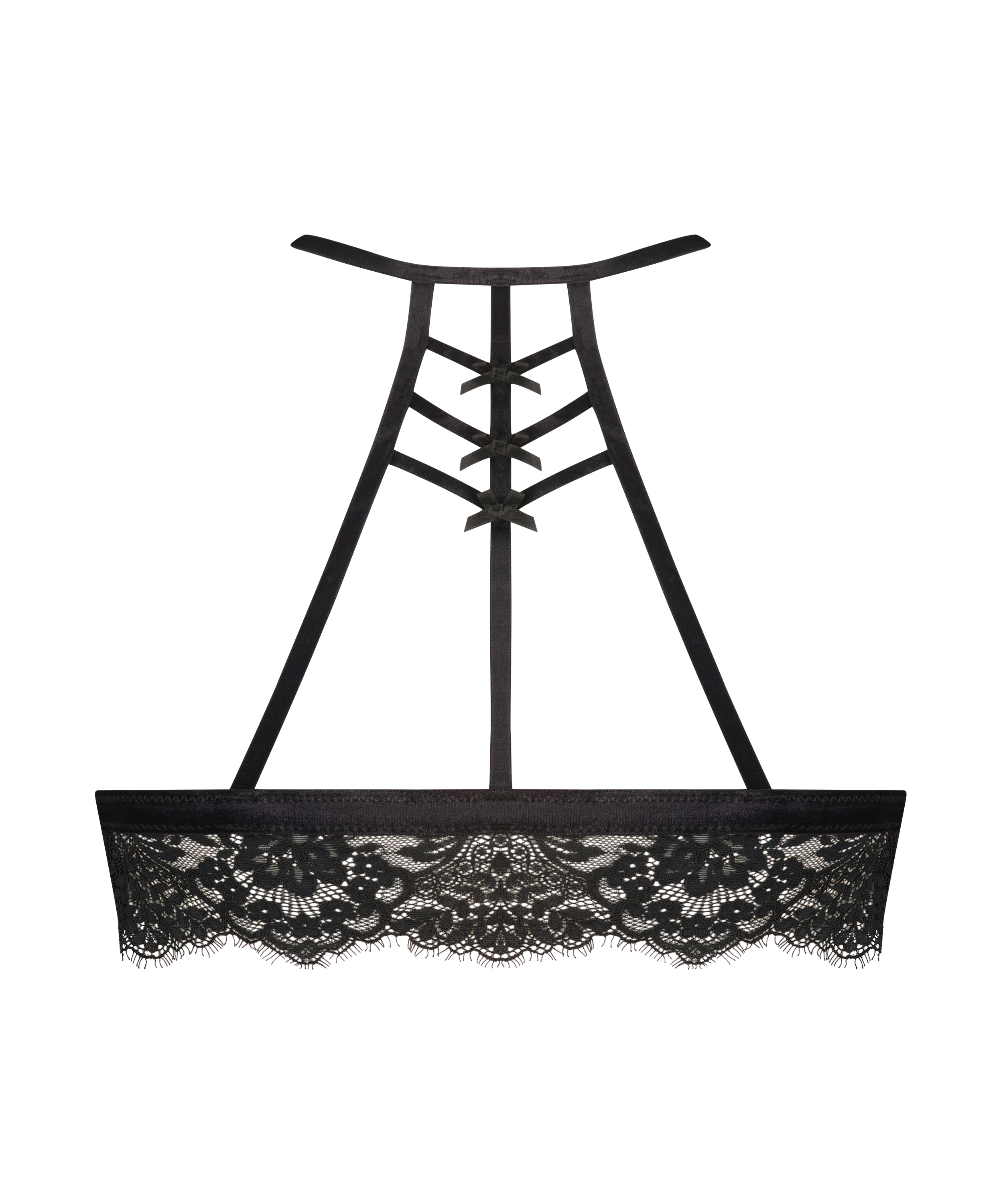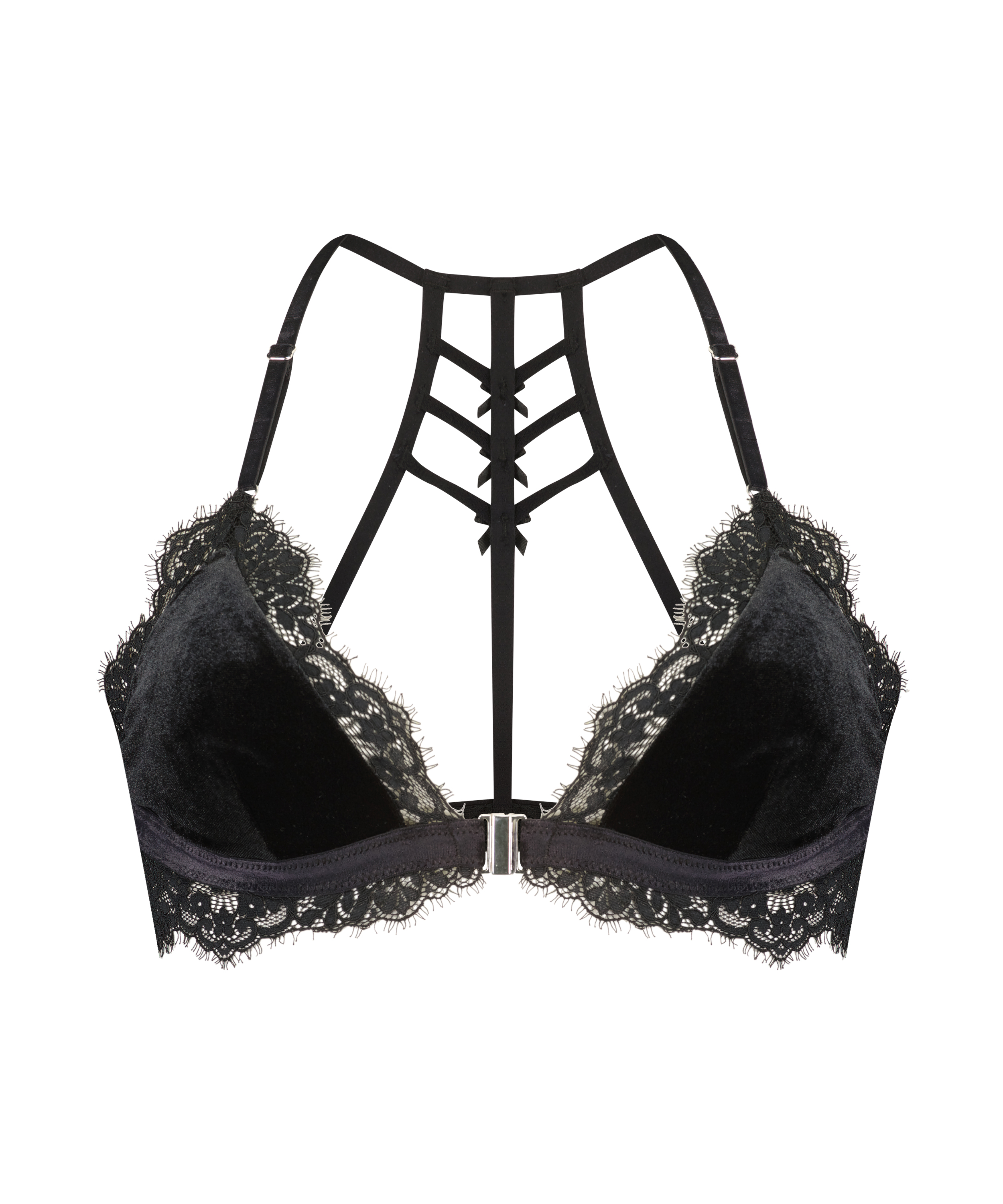 ¡Este bralette tan ideal no puede faltar en tu armario! El bralette tiene lazos divertidos y detalles de tiras en la espalda y está bellamente terminado con bordes de encaje. Este modelo tiene el cierre en la parte frontal. Combínalo con las braguitas a juego para completar tu conjunto