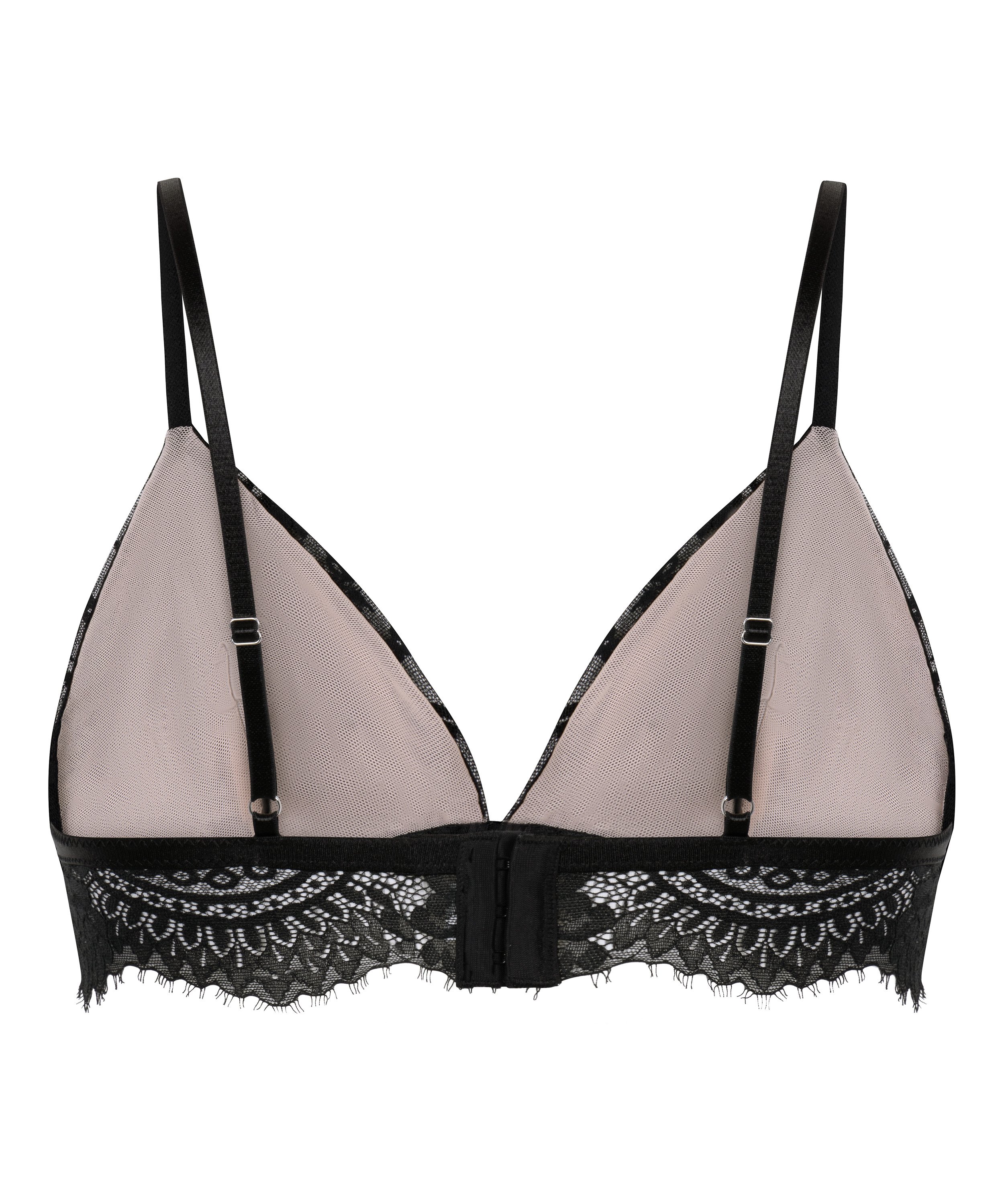 Abraza la elegancia con nuestro bralette triangular, diseñado para una sujeción ligera y un ajuste maravillosamente natural. Confeccionado en encaje, este bralette presenta una silueta triangular clásica que favorece sin copas preformadas, perfecta para llevar con capas o para relajarse. Gracias a su ligereza y a sus detalles románticos, es la elección ideal para ir cómoda en el día a día con un toque de encanto. Se puede combinar con la braguita a juego para lucir un look completo.