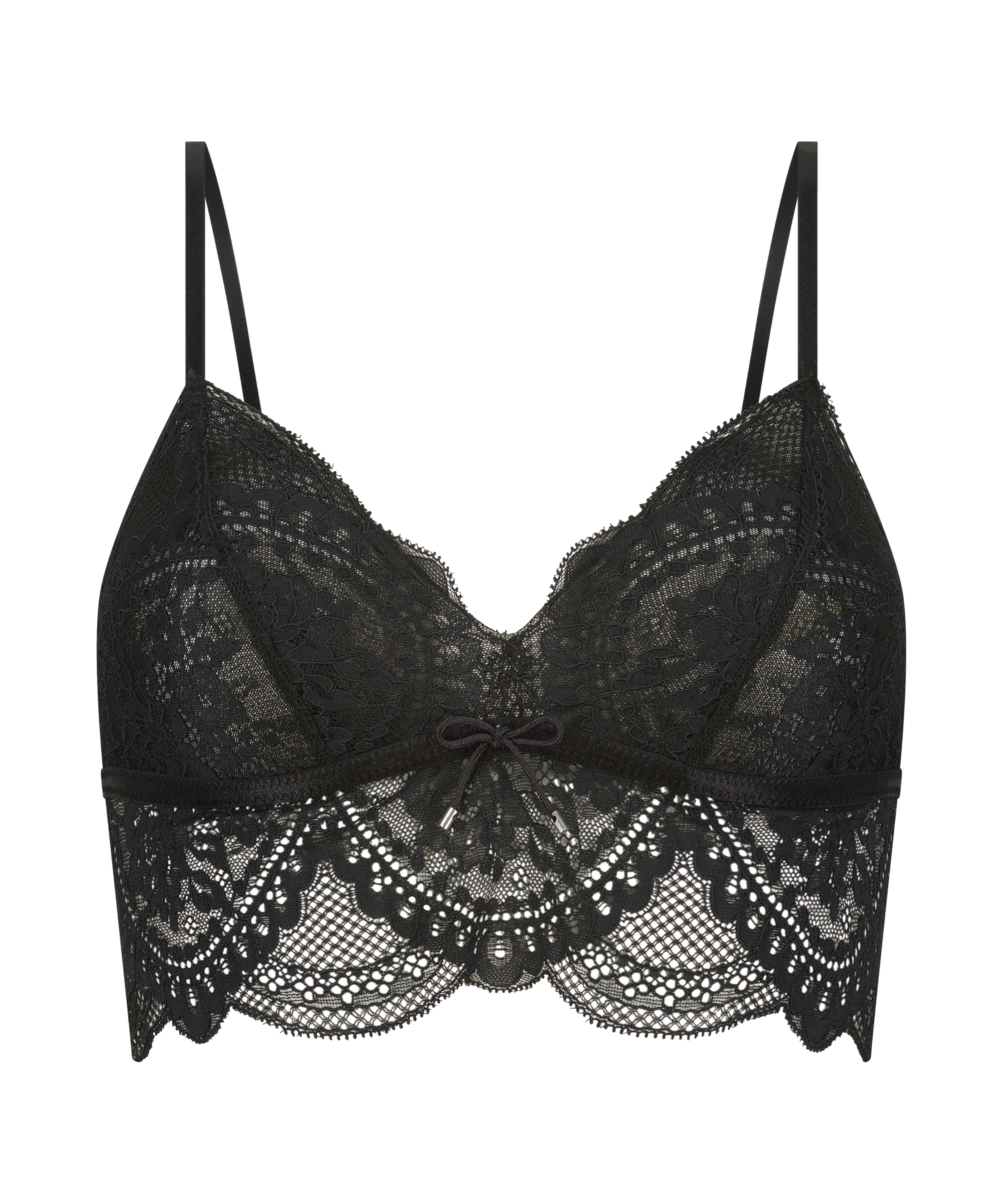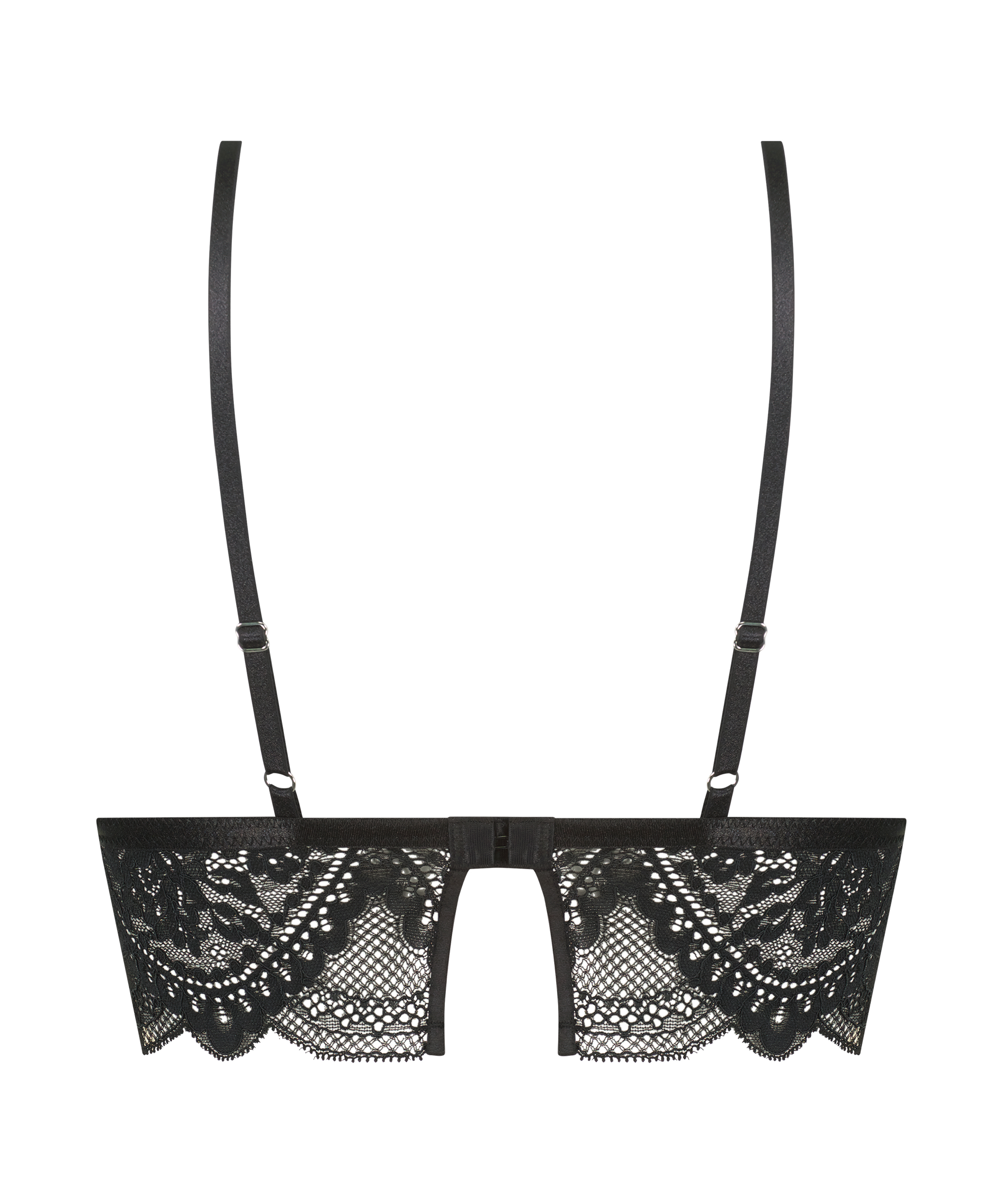 Siéntete muy femenina con este bonito bralette con encaje semitransparente y detalles de tiras en el centro. Combínalo con la braguita a juego para un look completo.