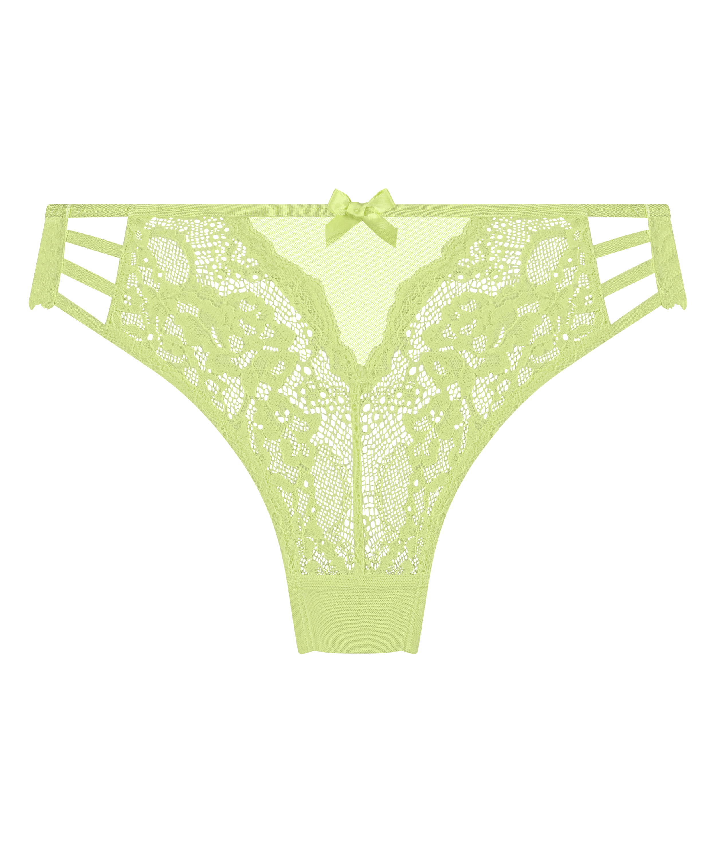 ¡Esta brasileña es lo más! ¡Los detalles de tiras en combinación con el bonito encaje completarán tu look! Combínala con tu sujetador favorito en el mismo color.