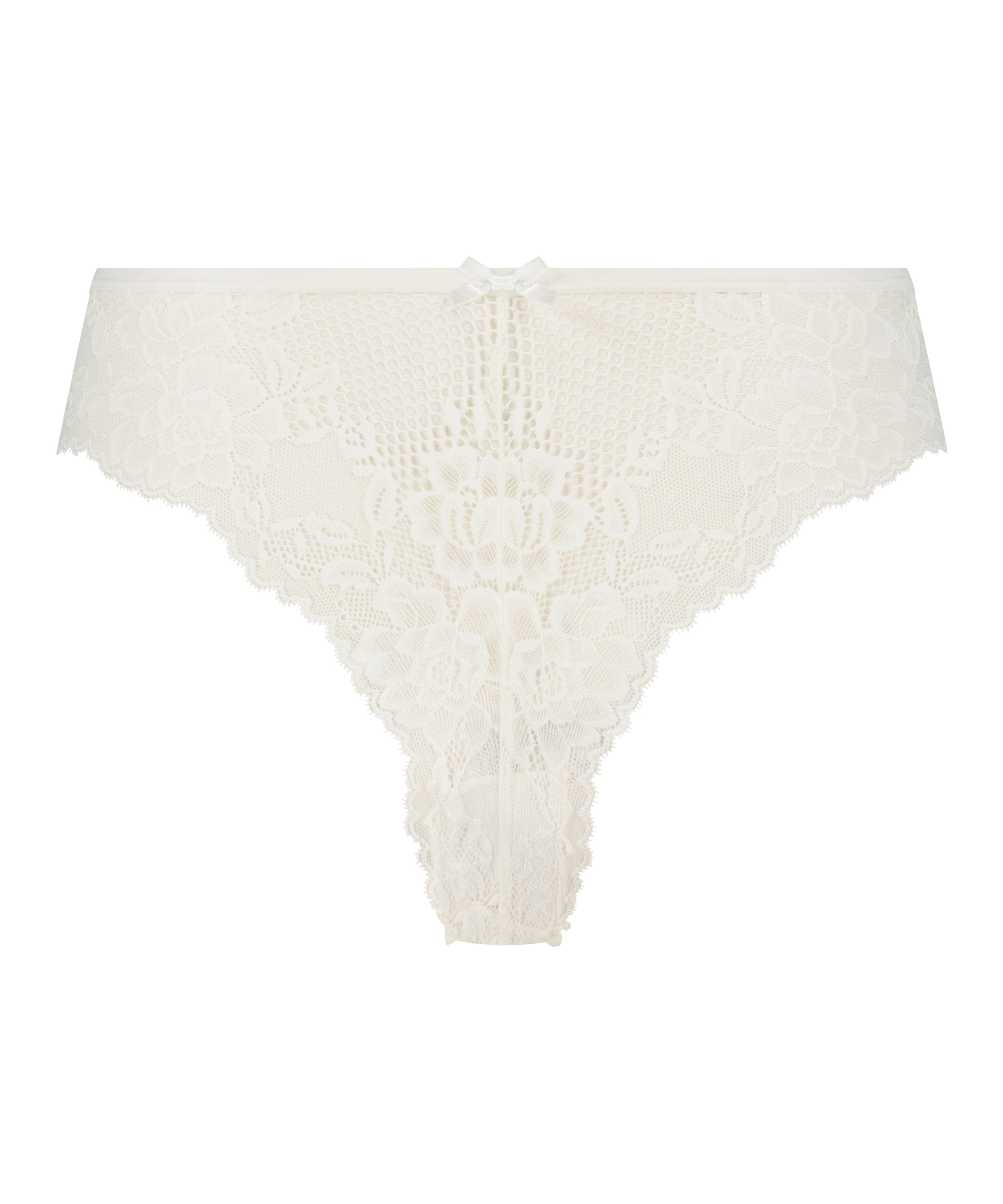 Esta braguita brasileña es semitransparente y tiene un acabado de abundante encaje. Su lacito delantero, ¡le da el toque final!