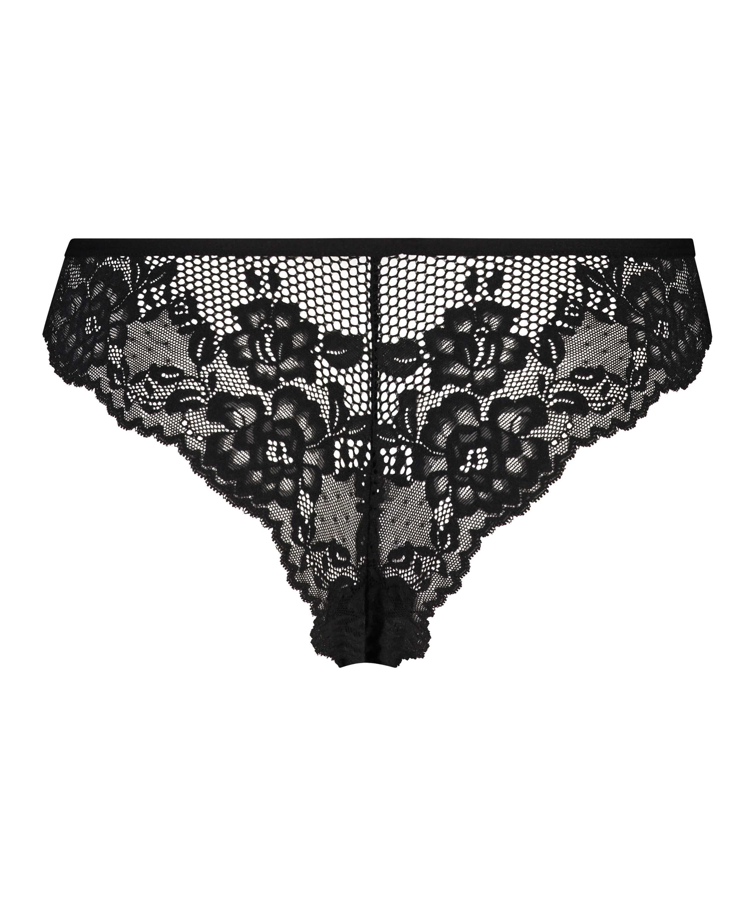 Esta braguita brasileña es semitransparente y tiene un acabado de abundante encaje. Su lacito delantero, ¡le da el toque final!