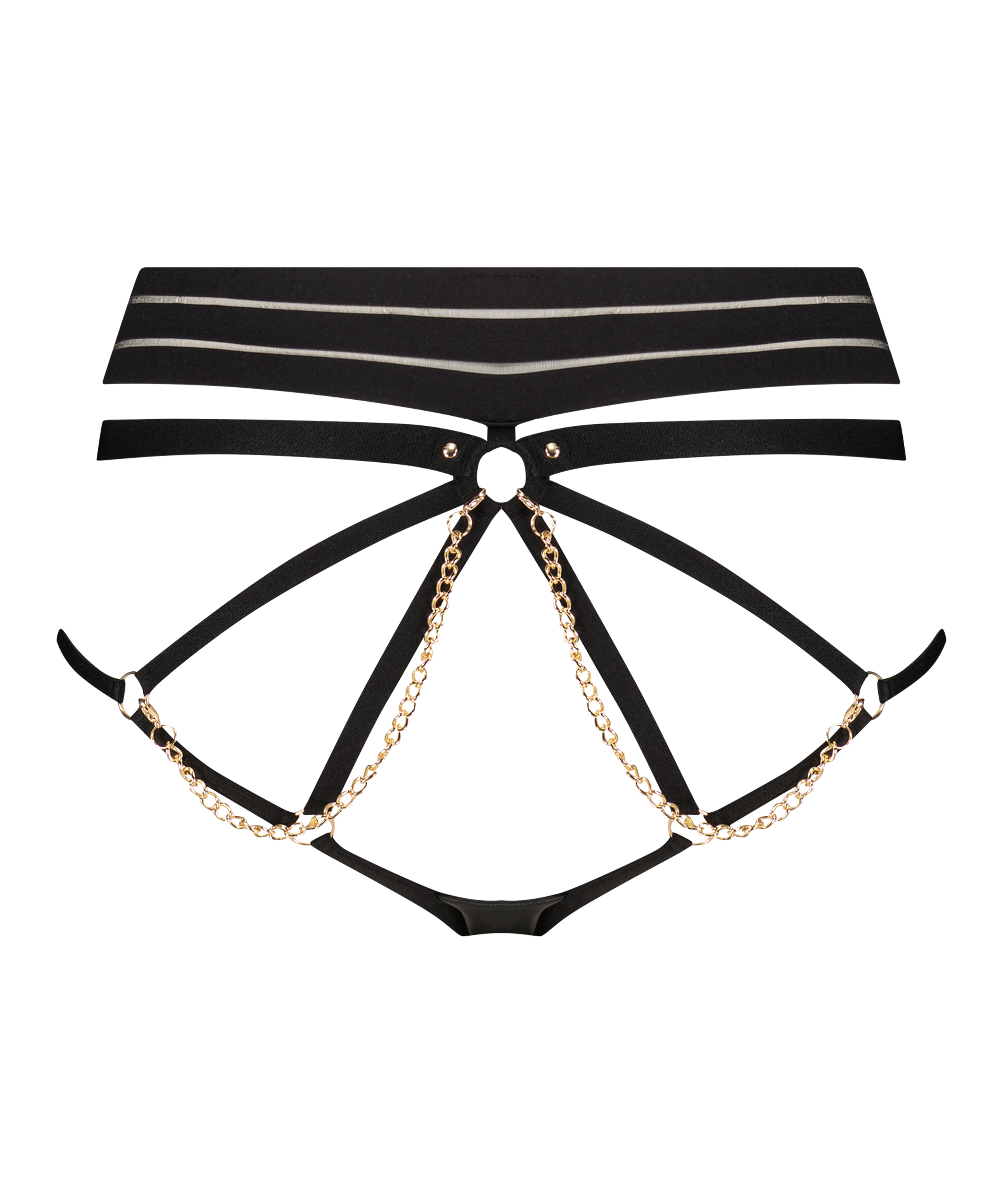 ¡Lleva tu conjunto de lencería al siguiente nivel con esta braguita brasileña supersexi! Decorada con detalles de tiras y cadenas doradas desmontables para un look picante. Tiene un detalle recortado en la parte posterior y el tanga está decorado con una cadena dorada desmontable. ¡Combínalo con el corpiño Hecate para completar el conjunto!