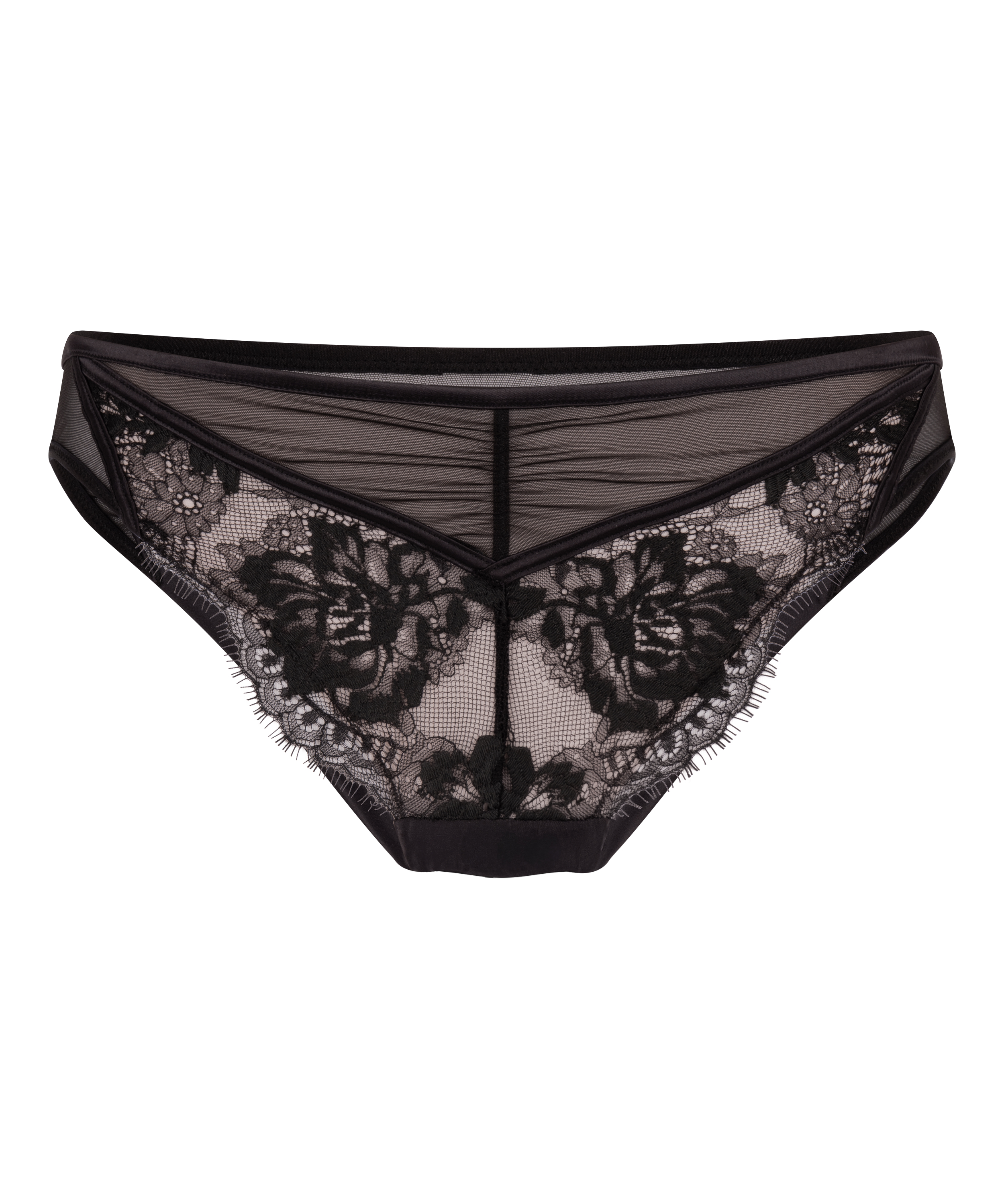 Romántica con un toque especial, esta brasileña de tiro alto es todo textura y confianza. El corte alto alarga las piernas, mientras que el satén le da un toque de glamour. El encaje traza tus curvas mientras que la malla con volantes aporta un movimiento juguetón. Se puede combinar con el sujetador a juego para un look ideal.
