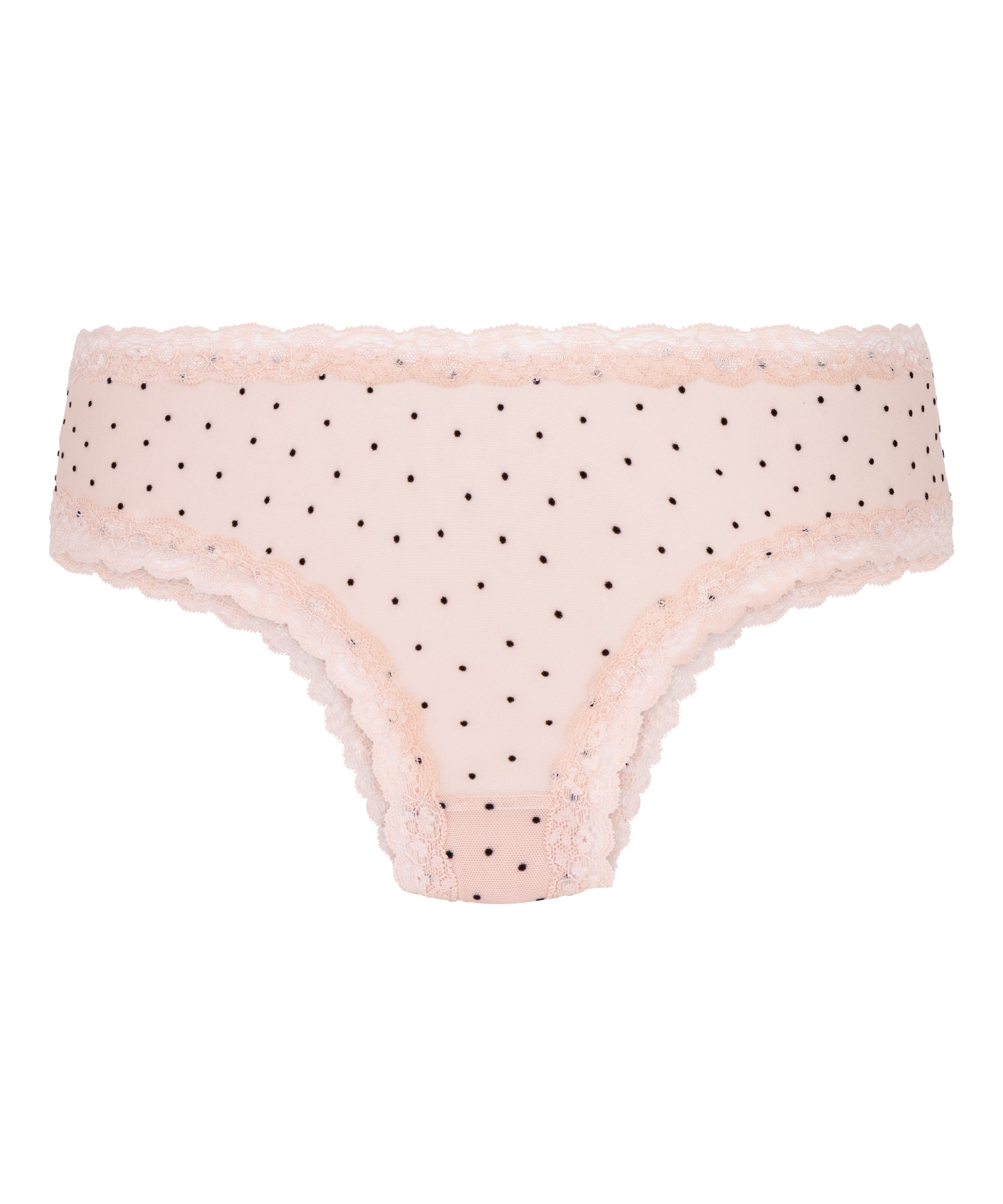 Coqueta, divertida y llena de encanto: nuestra braguita brasileña con lunares y corte en V da un giro dulce al diseño clásico. Hecha de malla con lunares suaves y un favorecedor corte frontal en V, ofrece un ajuste coqueto que abraza tus curvas. El tejido semi-transparente añade un toque juguetón, mientras que el corte brasileño equilibra cobertura y sensualidad. Lo suficientemente bonita para lucirla, lo suficientemente cómoda para el día a día.