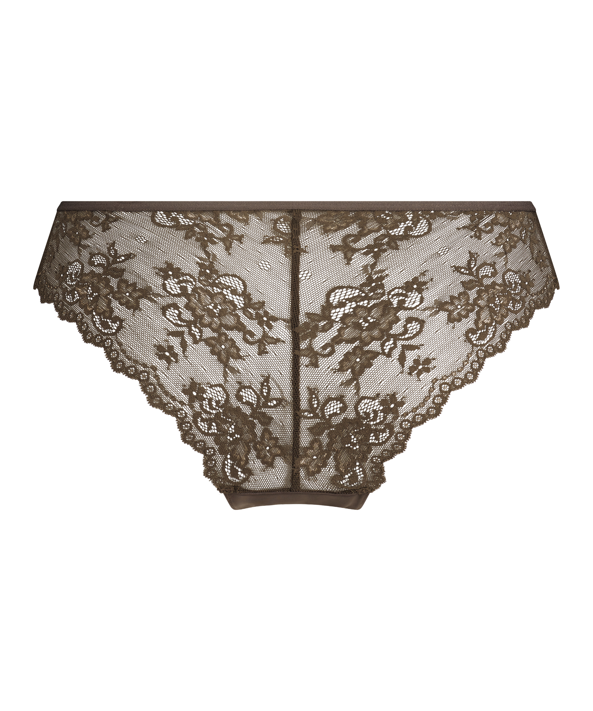 Al no tener costuras, esta braguita brasileña no se nota debajo de ropa ajustada. La parte trasera de encaje le da un aire seductor.
