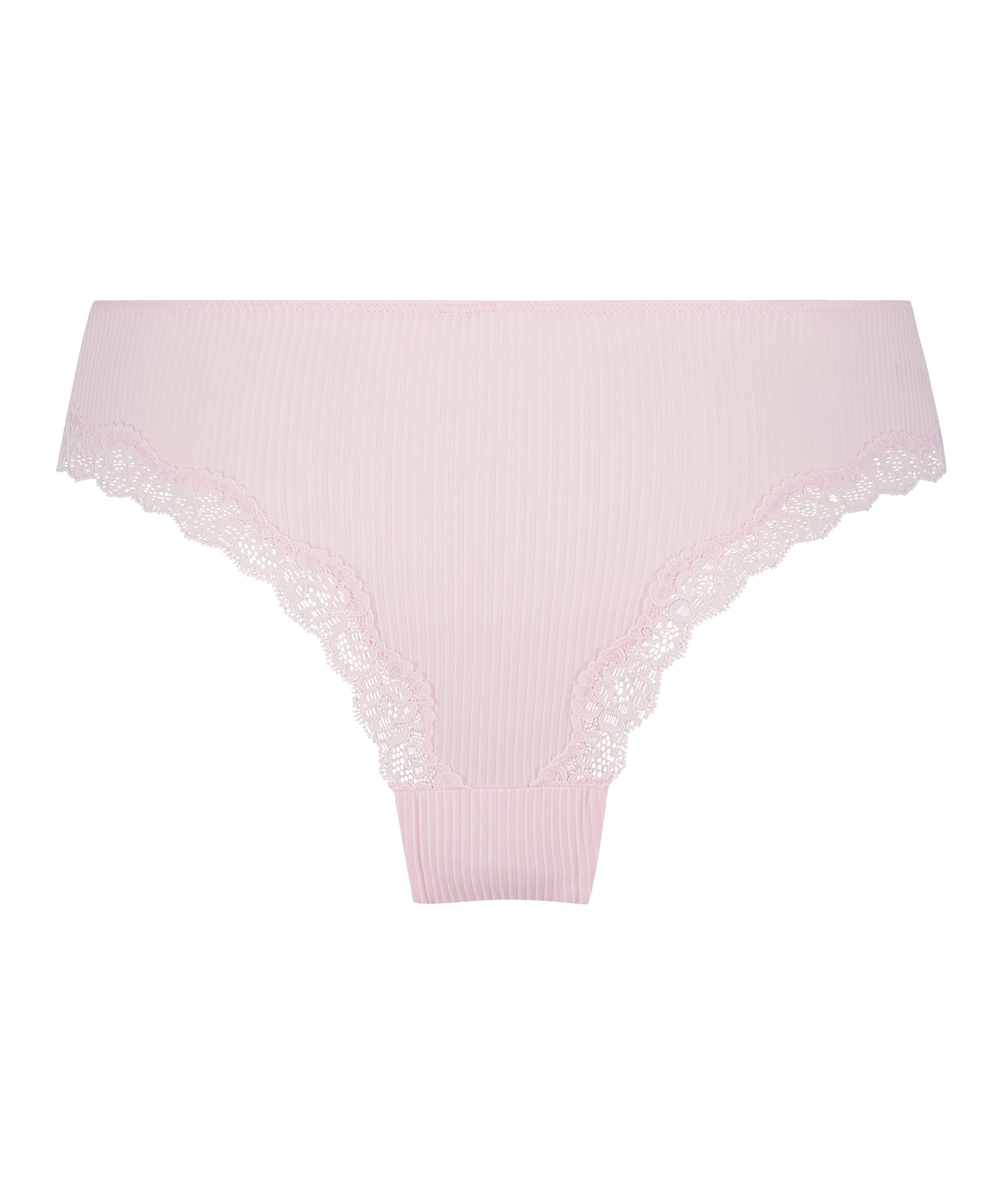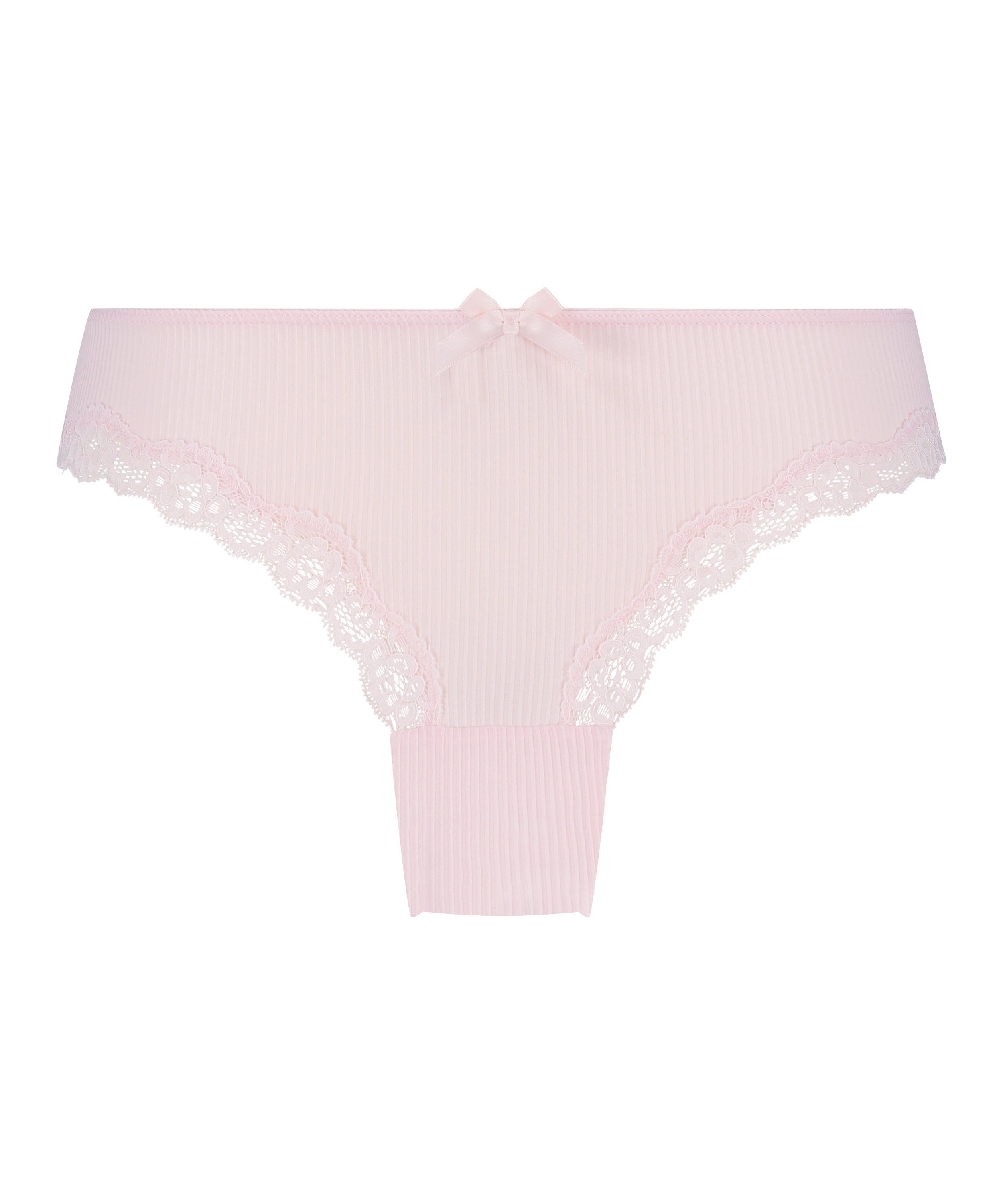 ¡Esta braguita brasileña es una prenda imprescindible! Está confeccionado en tejido de punto y tiene un acabado de ribete de encaje. Esta brasileña tiene un lacito en la parte delantera. Completa tu conjunto con el sujetador a juego.