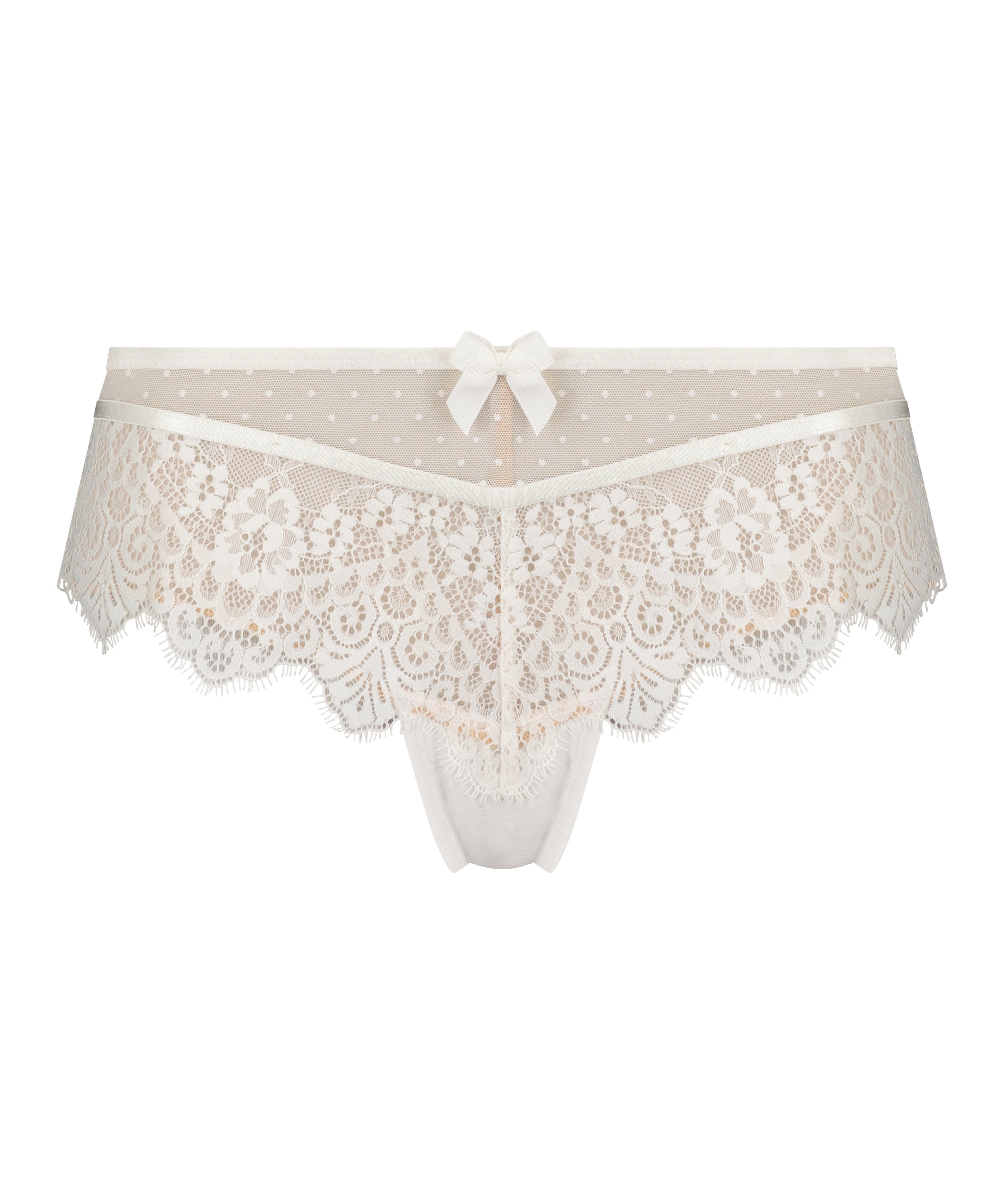 ¡Esta brasileña queda muy bien alrededor de tus nalgas! Esta bonita brasileña está hecha de encaje y un tejido transparente con un acabado de bonitos lunares.