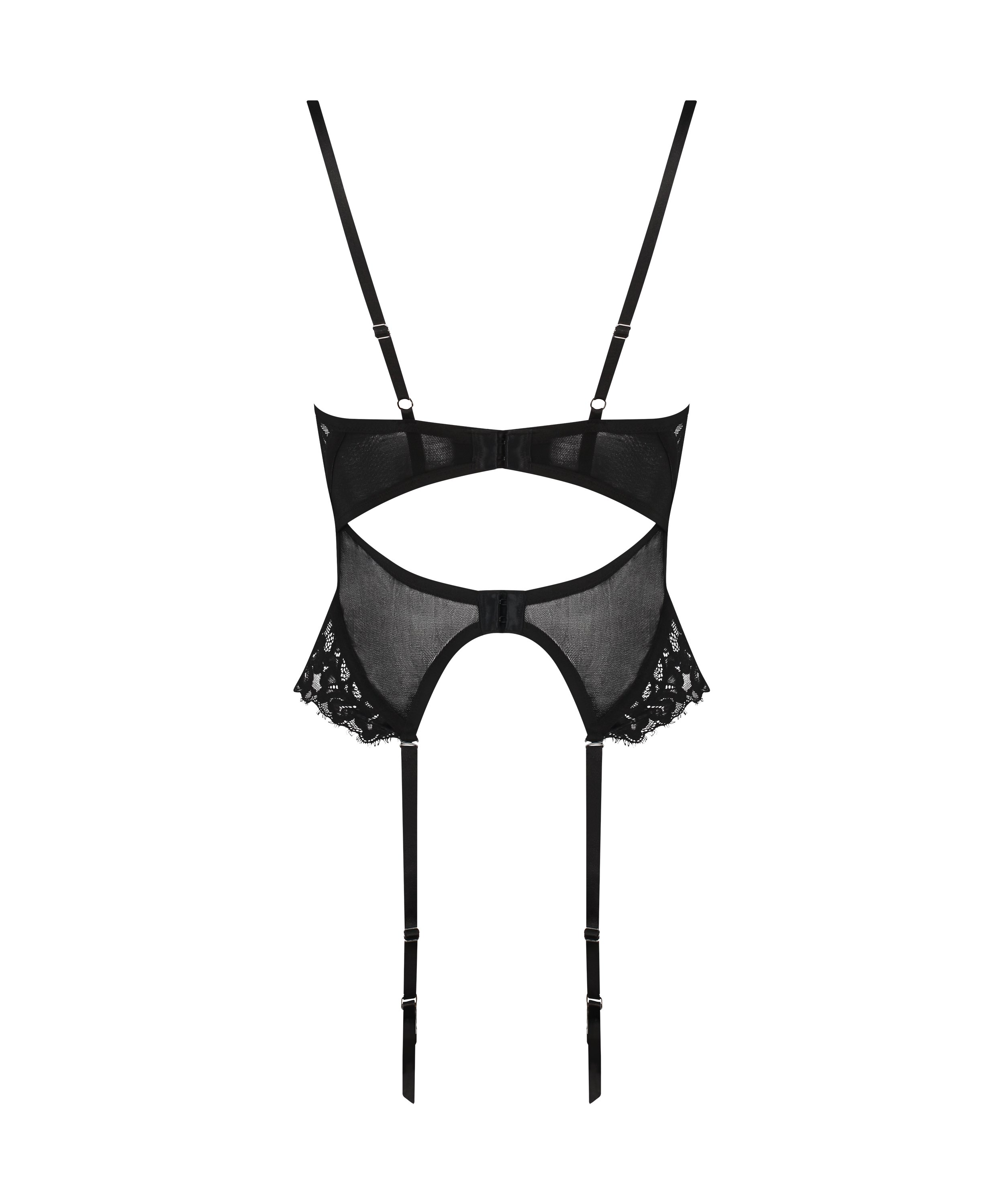 Renueva tu colección de lencería con nuestro seductor corpiño de encaje. Esta llamativa prenda cuenta con delicados detalles de encaje y sensuales aberturas de malla para un look cautivador. Ofrece un ajuste personalizado con las correas ajustables y un toque de elegancia juguetona con las correas de tirantes extraíbles. Combínalo con lencería y medias a juego para completar el conjunto.