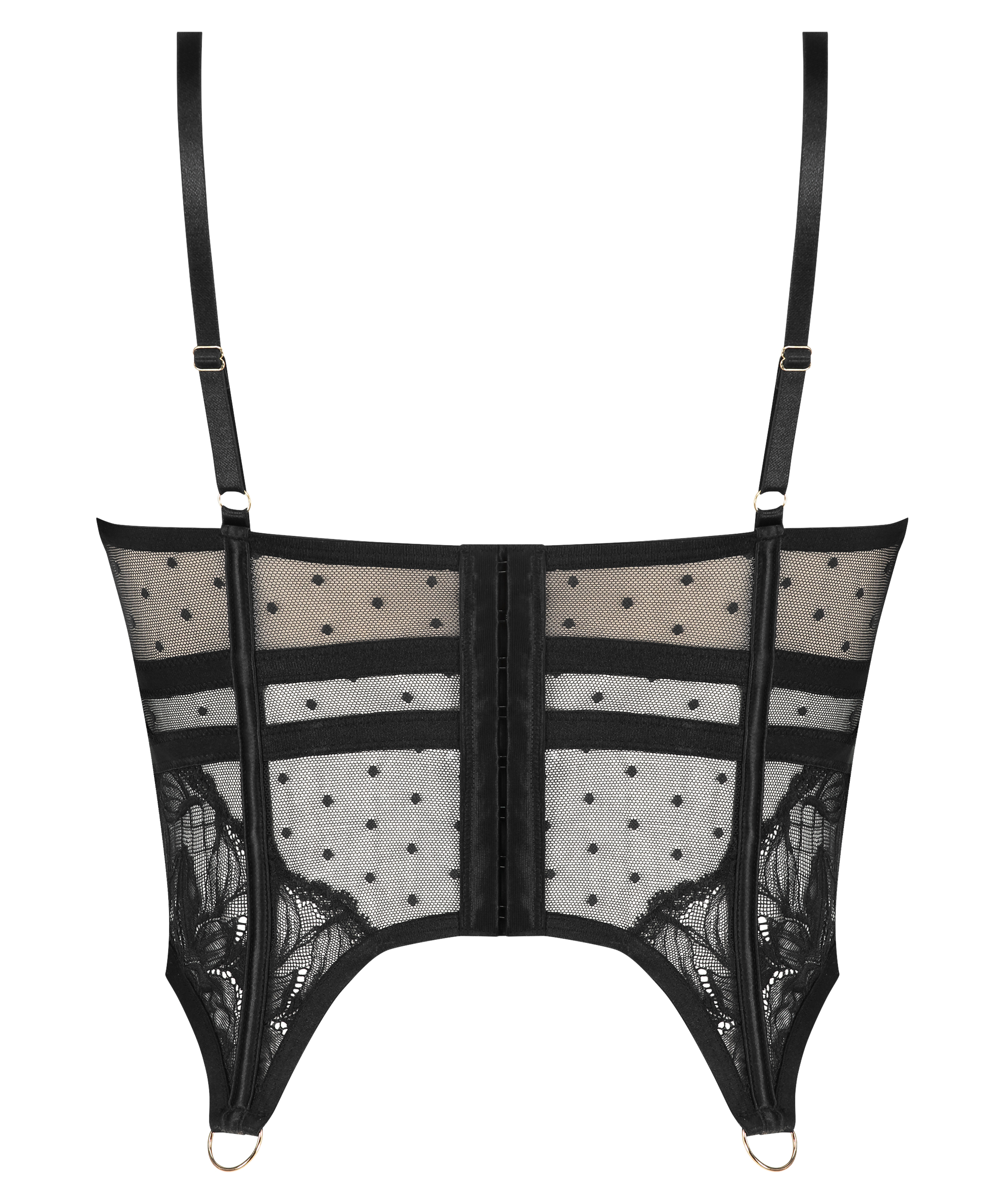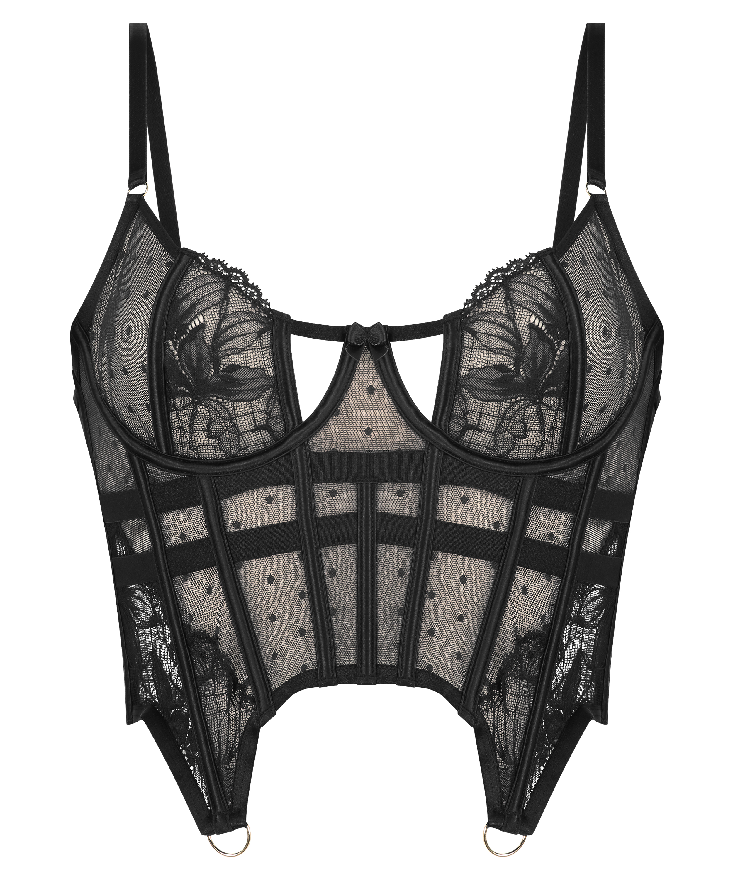 ¡Siéntete sexy con este precioso bustier!Con cómodas copas sin relleno con detalles recortados y de tiras. Es de gran apoyo debido al deshuesado frontal, lateral y posterior que te hará lucir increíble. Tiene un aspecto semitransparente completo de encaje y malla, y potencial para sujetar correas de calcetería. ¡Completa el conjunto con las braguitas a juego! Forma parte de la Colección Private.