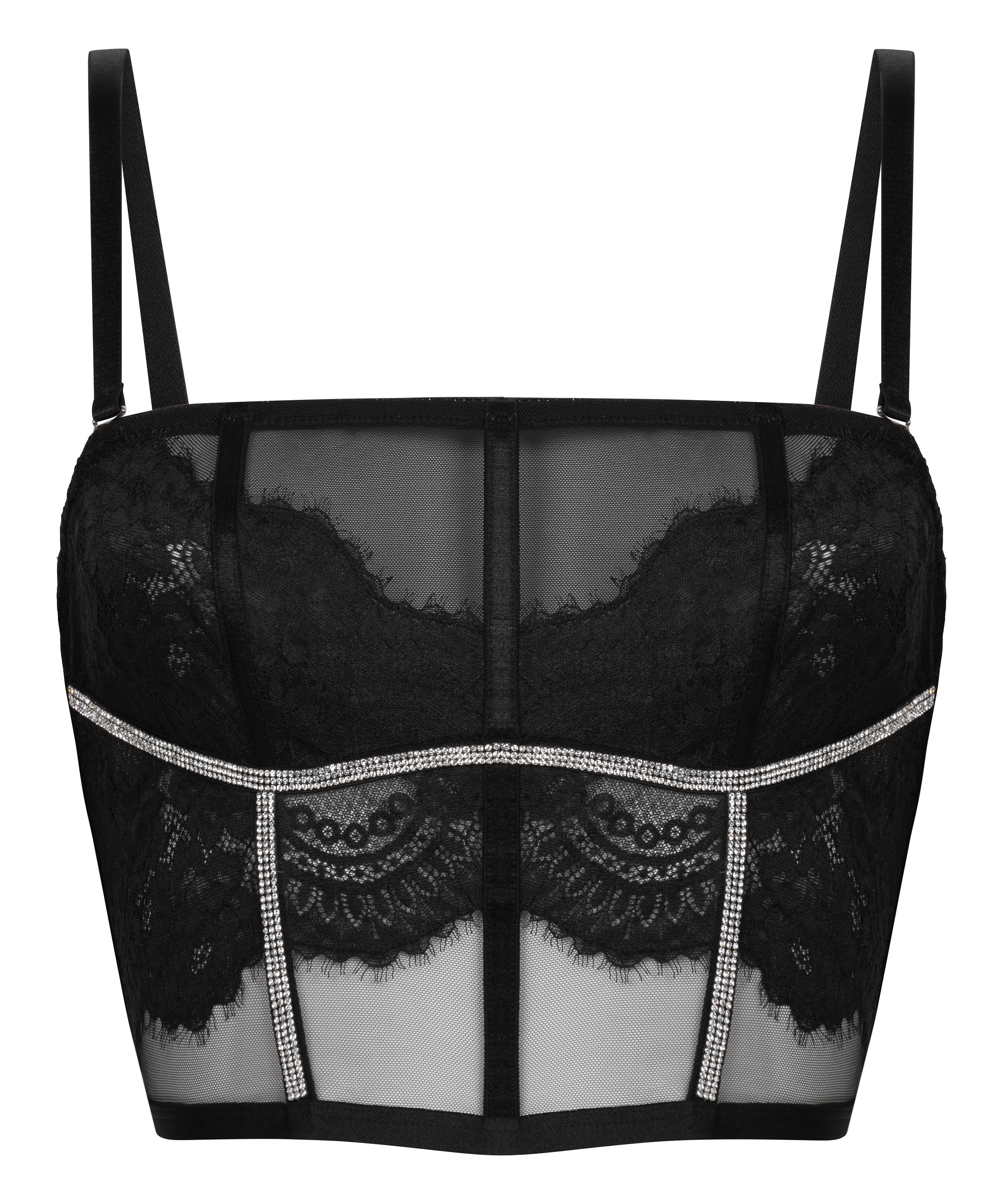 Llama la atención con este deslumbrante bustier. Diseñado con paneles de malla y encaje, está realzado con destellos que captan la luz con cada movimiento. Las copas no preformadas ofrecen una silueta natural, mientras que el ajuste estructurado moldea y sujeta con suavidad. Se puede combinar con la braguita a juego para lucir un look completo.