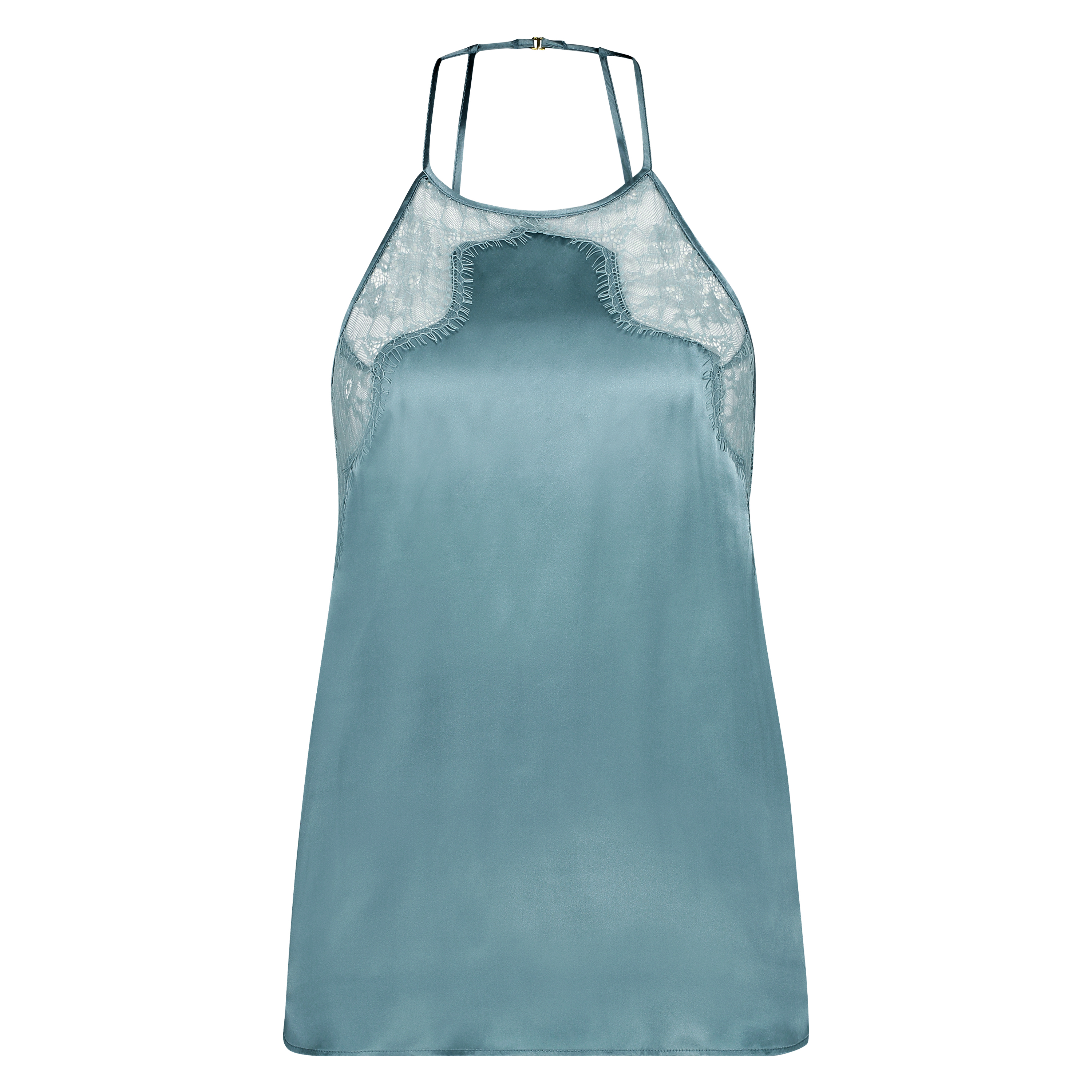 Una bonita y suntuosa camiseta de nuestra colección Noir. El top tiene un cuello de estilo halter y un acabado con un bonito de encaje. Combínalo con los artículos a juego.