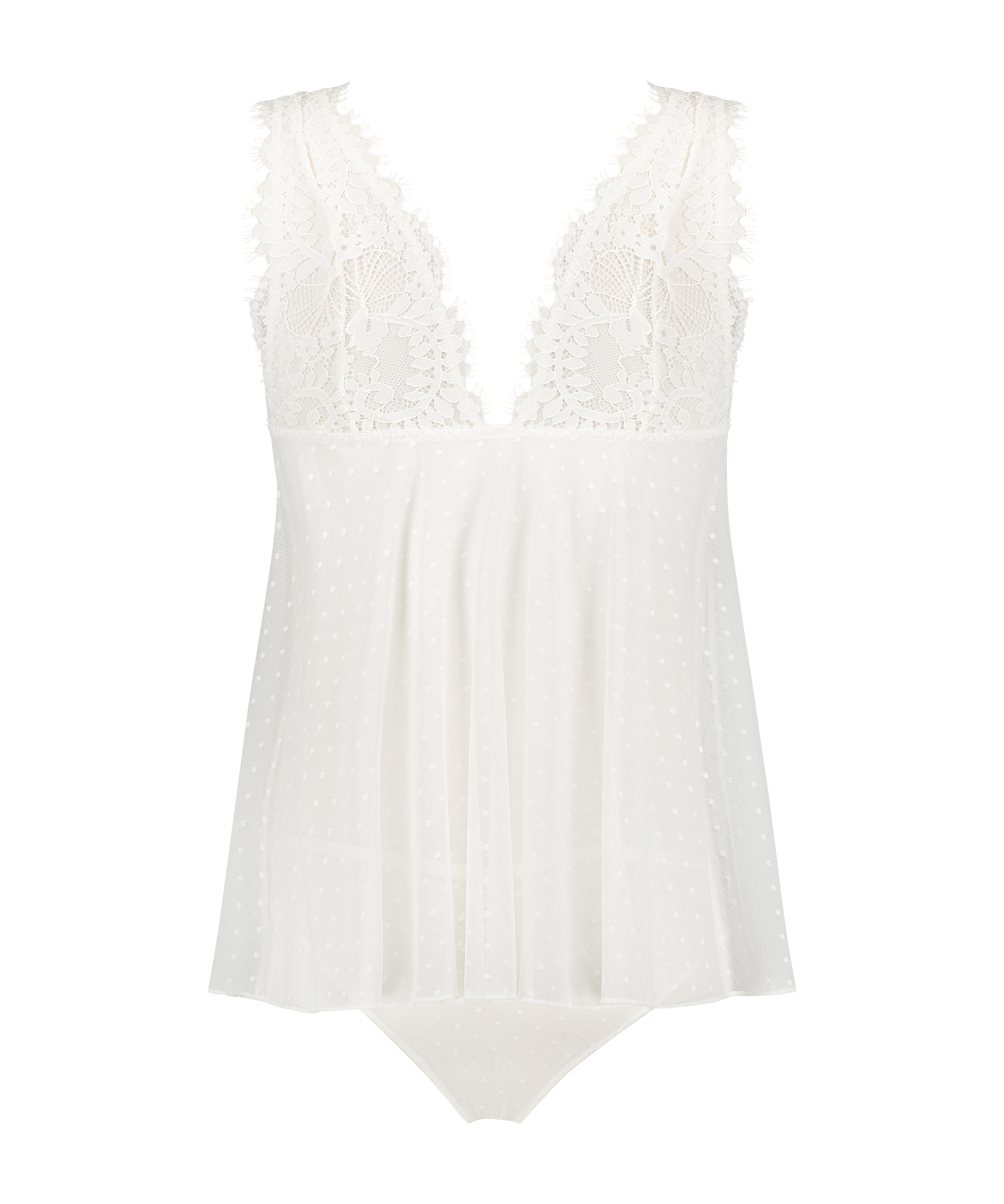 ¿En busca de un camiset cómodo y elegante a la vez? ¡Entonces este es ideal! La parte superior tiene escote en forma de pico y detalles de encaje. La braguita esta hecha en gran parte de rejilla con estampado.