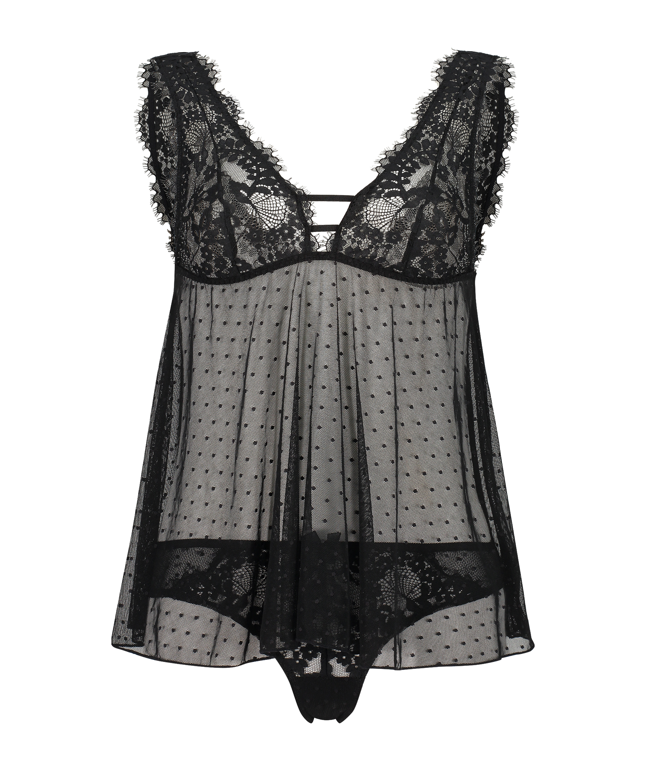 ¿En busca de un camiset cómodo y elegante a la vez? ¡Entonces este es ideal! La parte superior tiene escote en forma de pico y detalles de encaje. La braguita esta hecha en gran parte de rejilla con estampado.