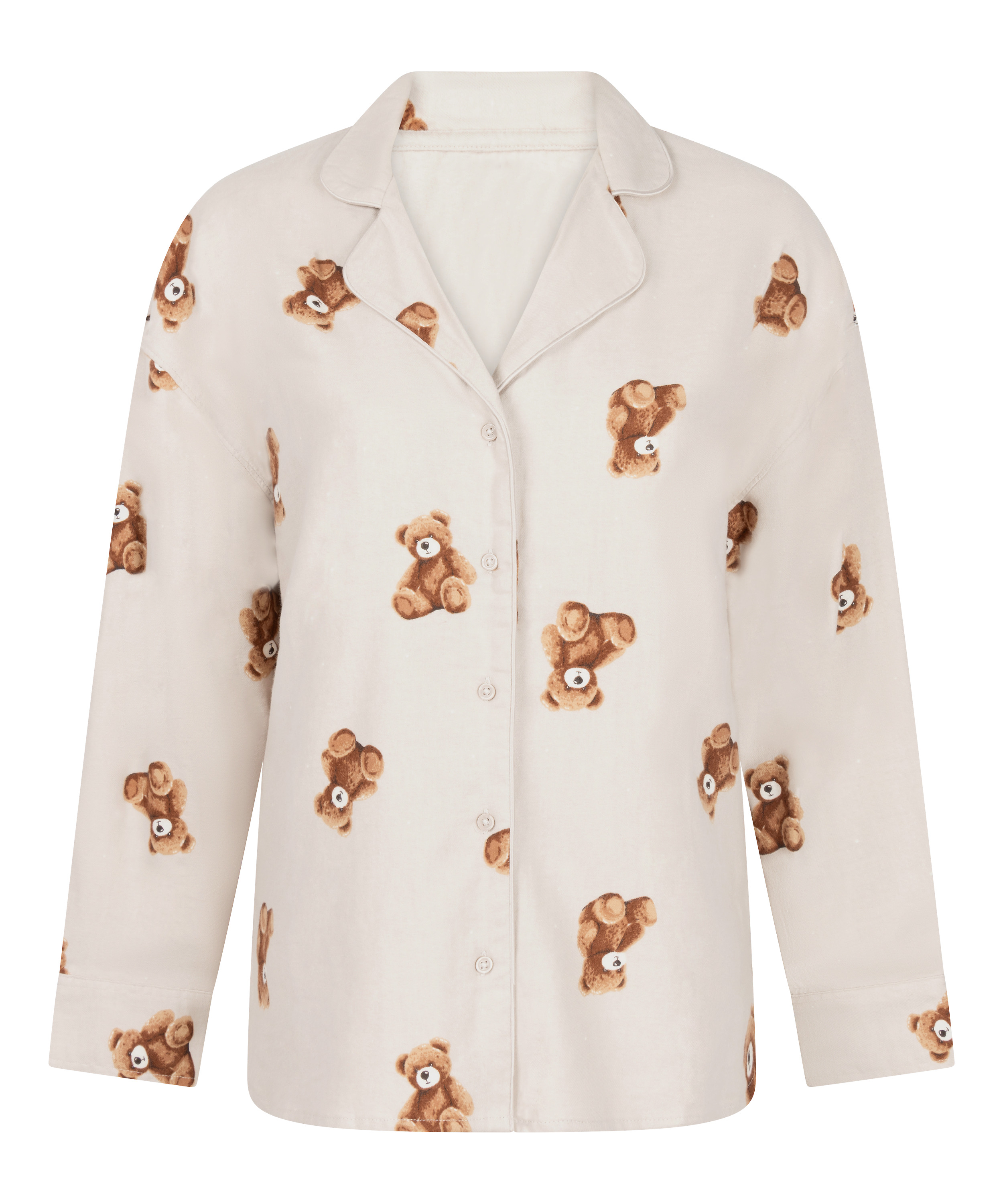 Envuélvete en calidez con esta encantadora chaqueta de pijama, pensada para las noches en casa y las mañanas perezosas. Confeccionado en suave sarga de franela, cuenta con cuello clásico, manga larga y una botonadura completa en la parte delantera para un look atemporal. El alegre estampado de osos añade un toque divertido y acogedor que te encantará. Es perfecto para las noches más frescas, y se puede combinar con la parte de abajo a juego para un look completo.