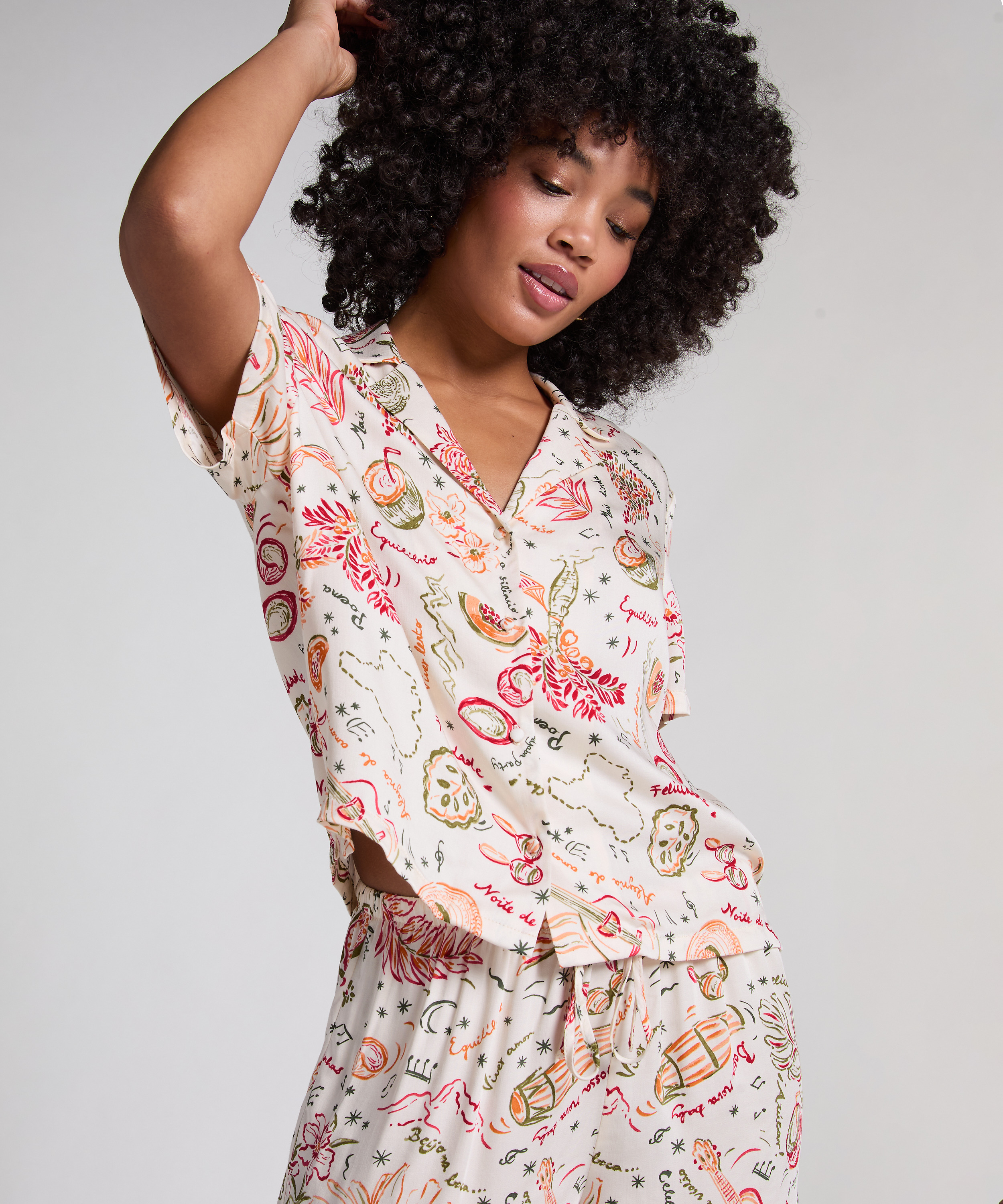 Esta camisa para dormir presenta un tejido suave y ligero que proporciona el máximo confort para una noche de descanso. El elegante cuello con diseño plisado y su escote en pico aportan un toque de sofisticación. Los botones recubiertos de tela completan el aspecto refinado para disfrutar de una experiencia de ensueño tranquila y elegante.