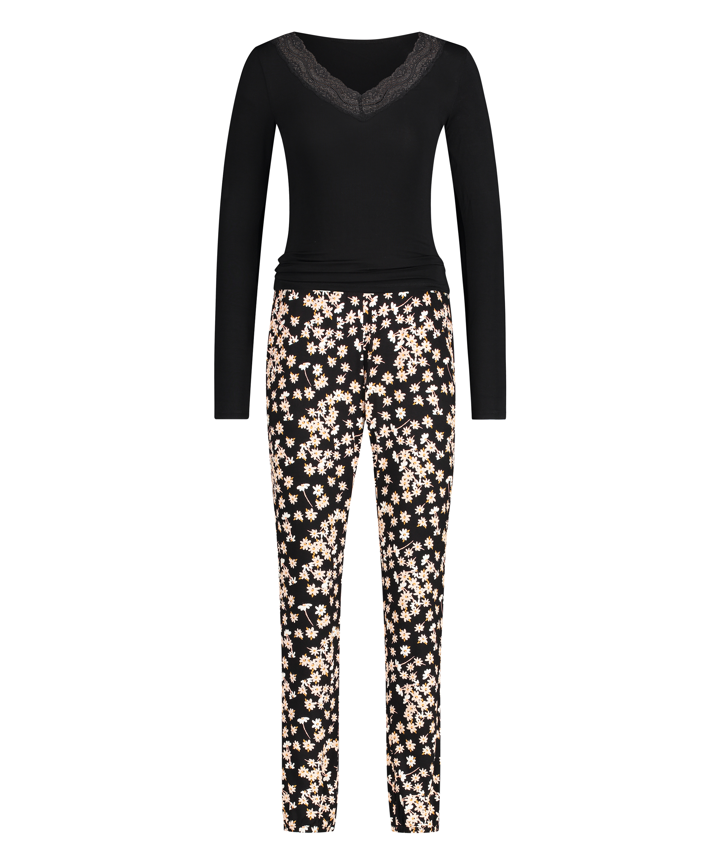 ¡Disfruta de noches cálidas con este cómodo pijama! La parte superior tiene detalles de encaje y los pantalones son estampados.