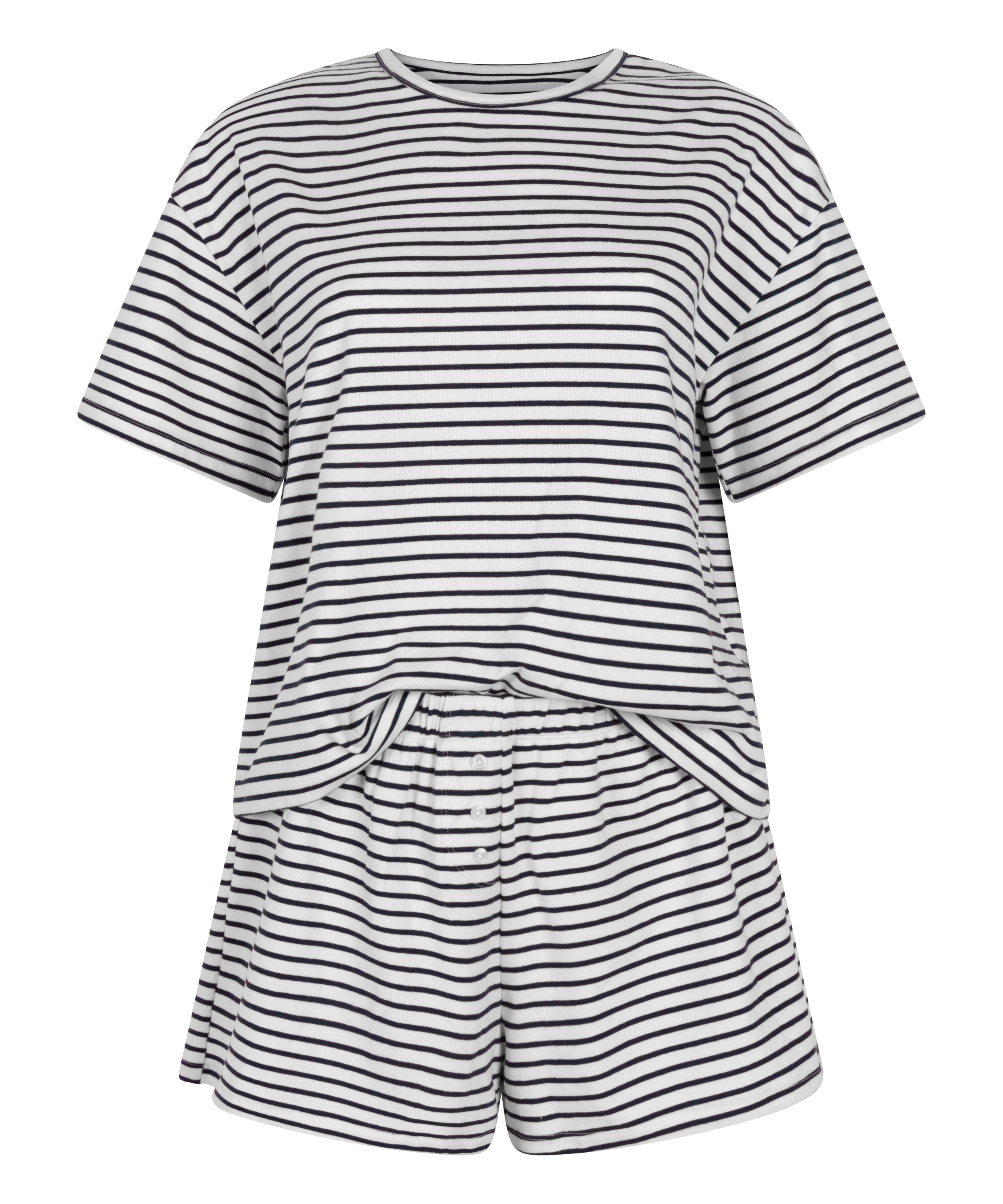 Relájate con estilo y comodidad con este acogedor conjunto de pijama. Incluye un pantalón corto y una camiseta de manga corta a juego. Fabricado en tejido de punto jersey, está diseñado para moverse contigo y ofrecer una noche de sueño perfecta o momentos de relax. Su corte holgado lo convierte en un favorito para las noches cálidas – un imprescindible en tu cajón de ropa de dormir.