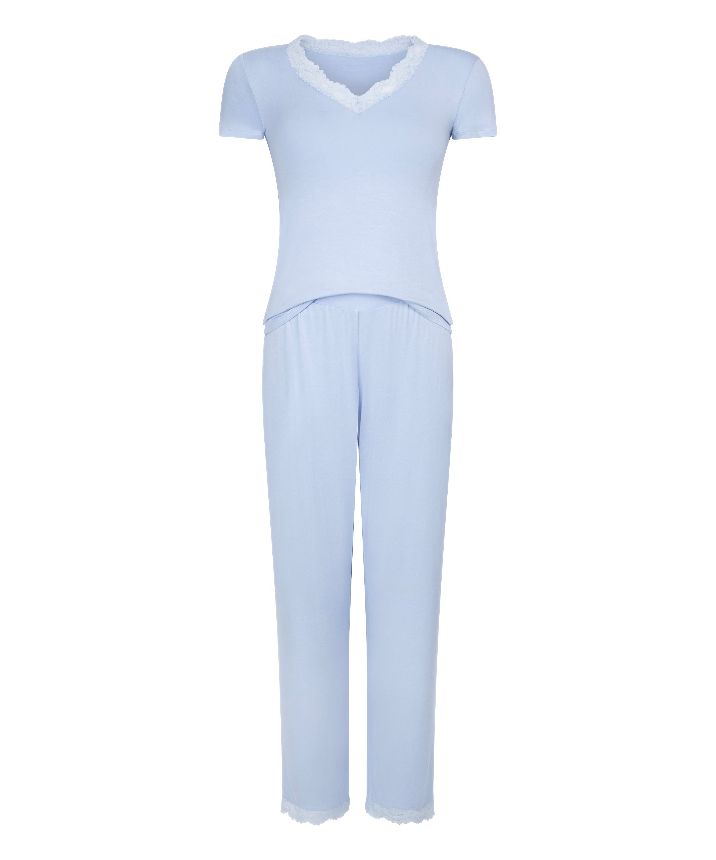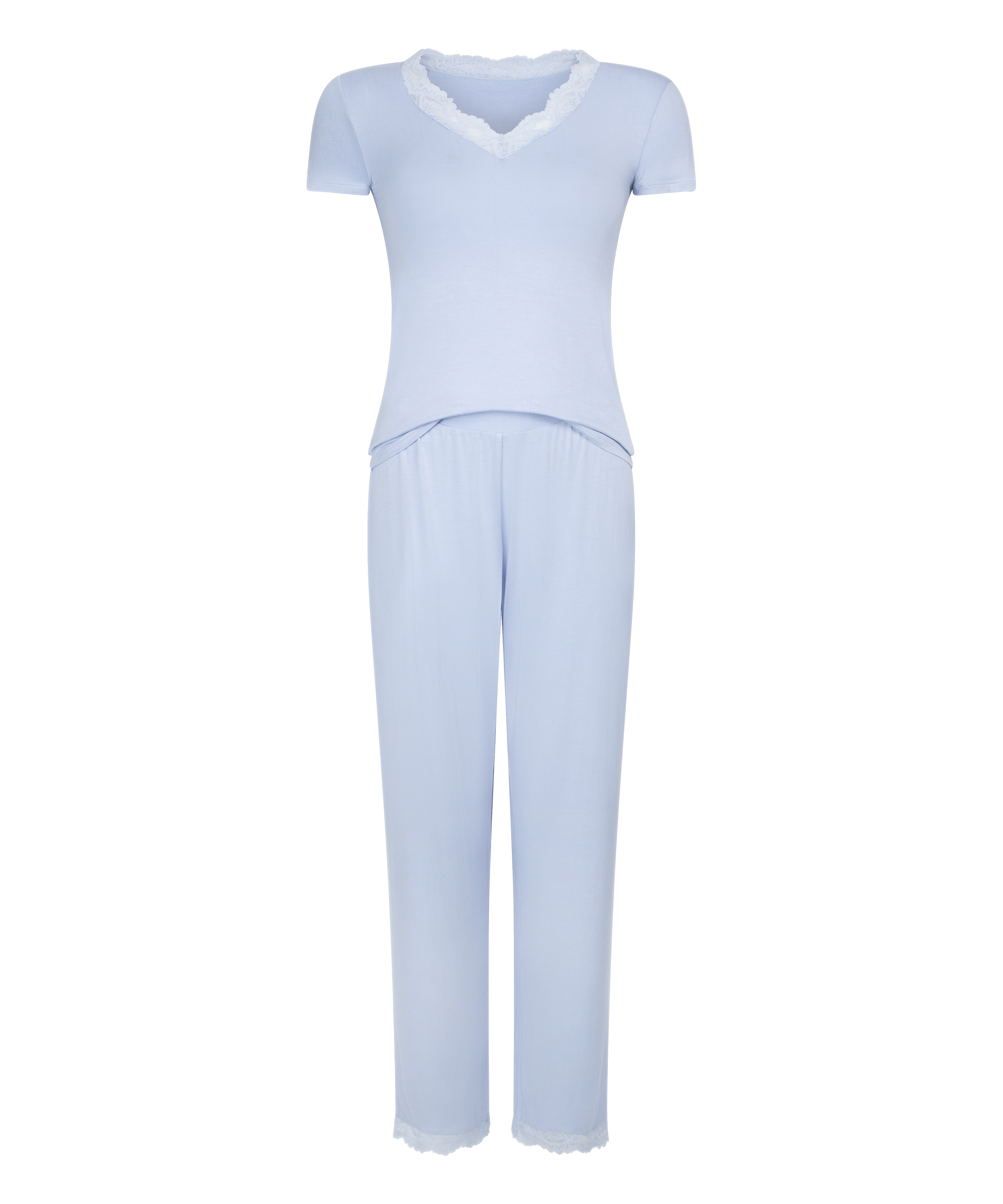 Relájate con estilo con nuestro conjunto de pijama, diseñado para ofrecer máxima comodidad y elegancia. Este conjunto de dos piezas incluye un top suave y transpirable de manga corta con un favorecedor escote en V adornado con encaje. Se combina con pantalones largos y fluidos para un ajuste relajado y detalles de encaje en el dobladillo. Este conjunto es perfecto para descansar o dormir plácidamente.