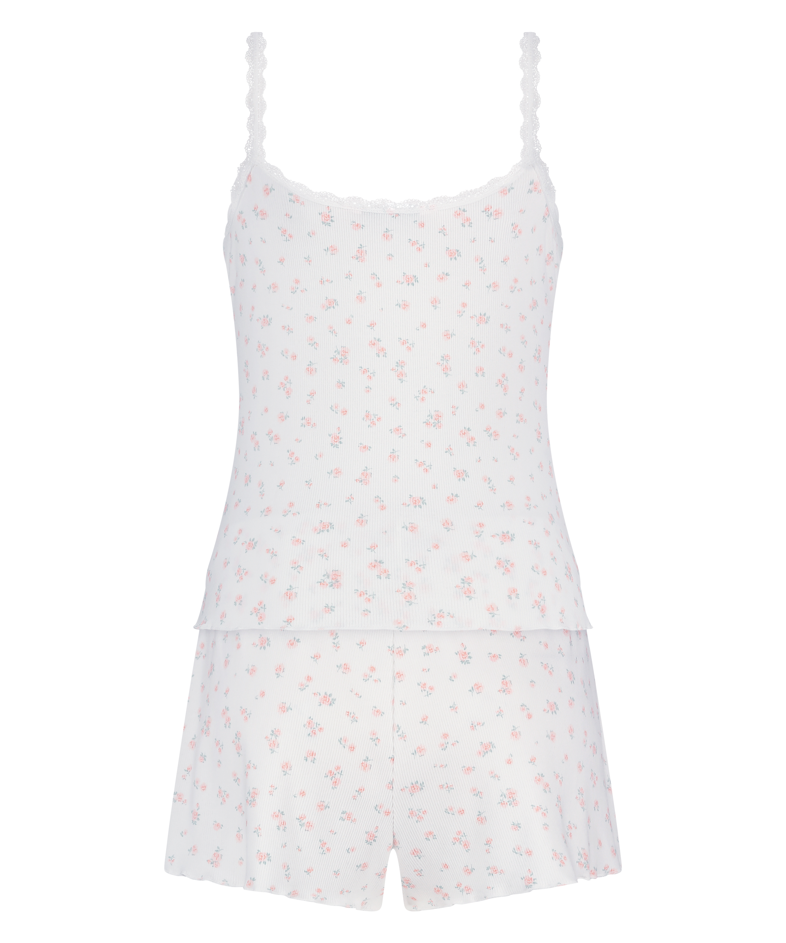 Mejora tu ropa de dormir con nuestro conjunto de pijama. Este set conjunto de dos piezas incluye un suave top de canalé y un pantalón corto a juego, diseñados para un ajuste relajado y cómodo. El top presenta detalles de encaje a lo largo del escote, añadiendo un toque femenino a su acogedor diseño.