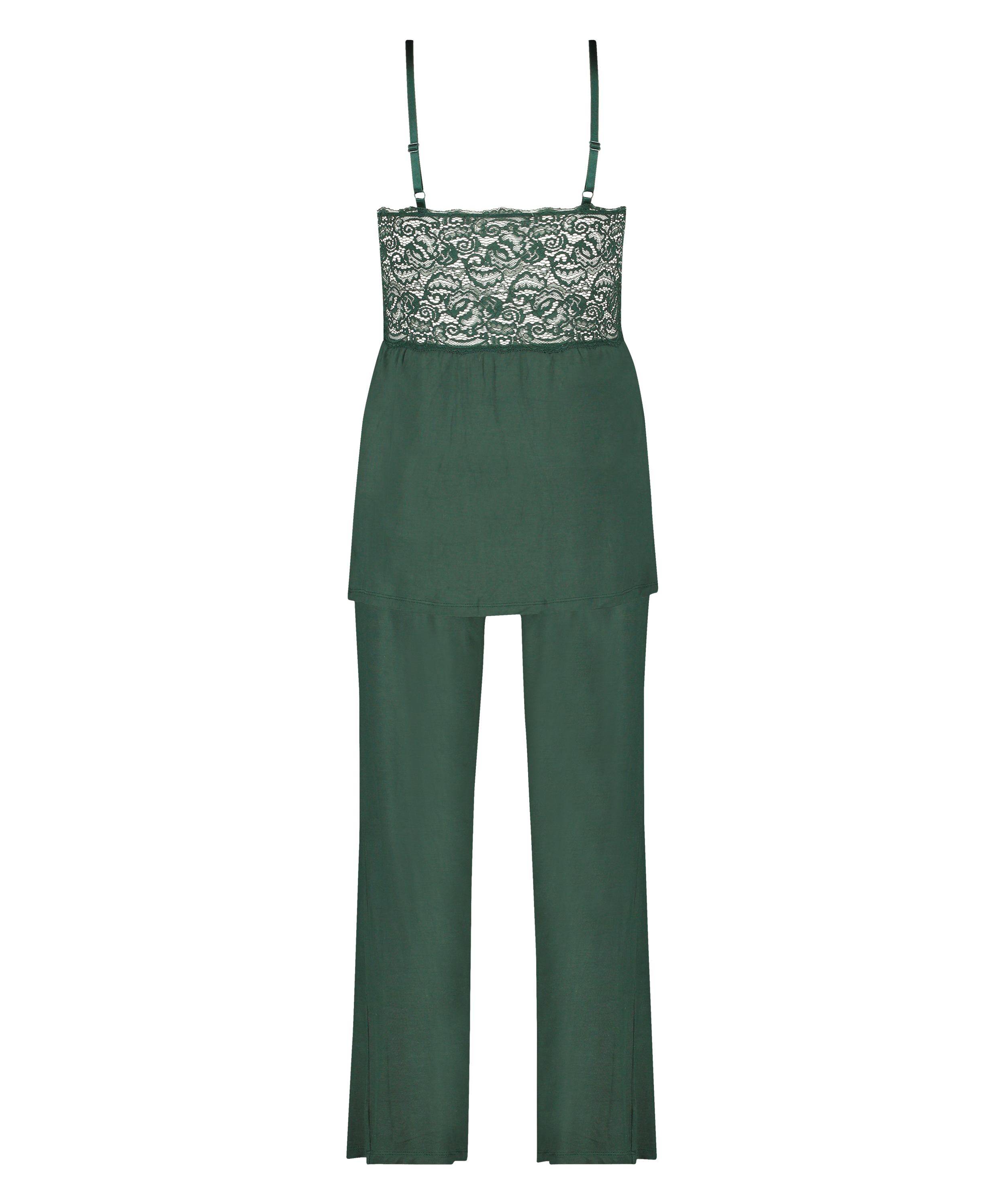 ¡Este pijama es comodísimo y tiene un acabado con un encaje precioso! El pantalón y la parte superior están hechos de un tejido que queda suelto sobre el cuerpo, y las cintas son ajustables!