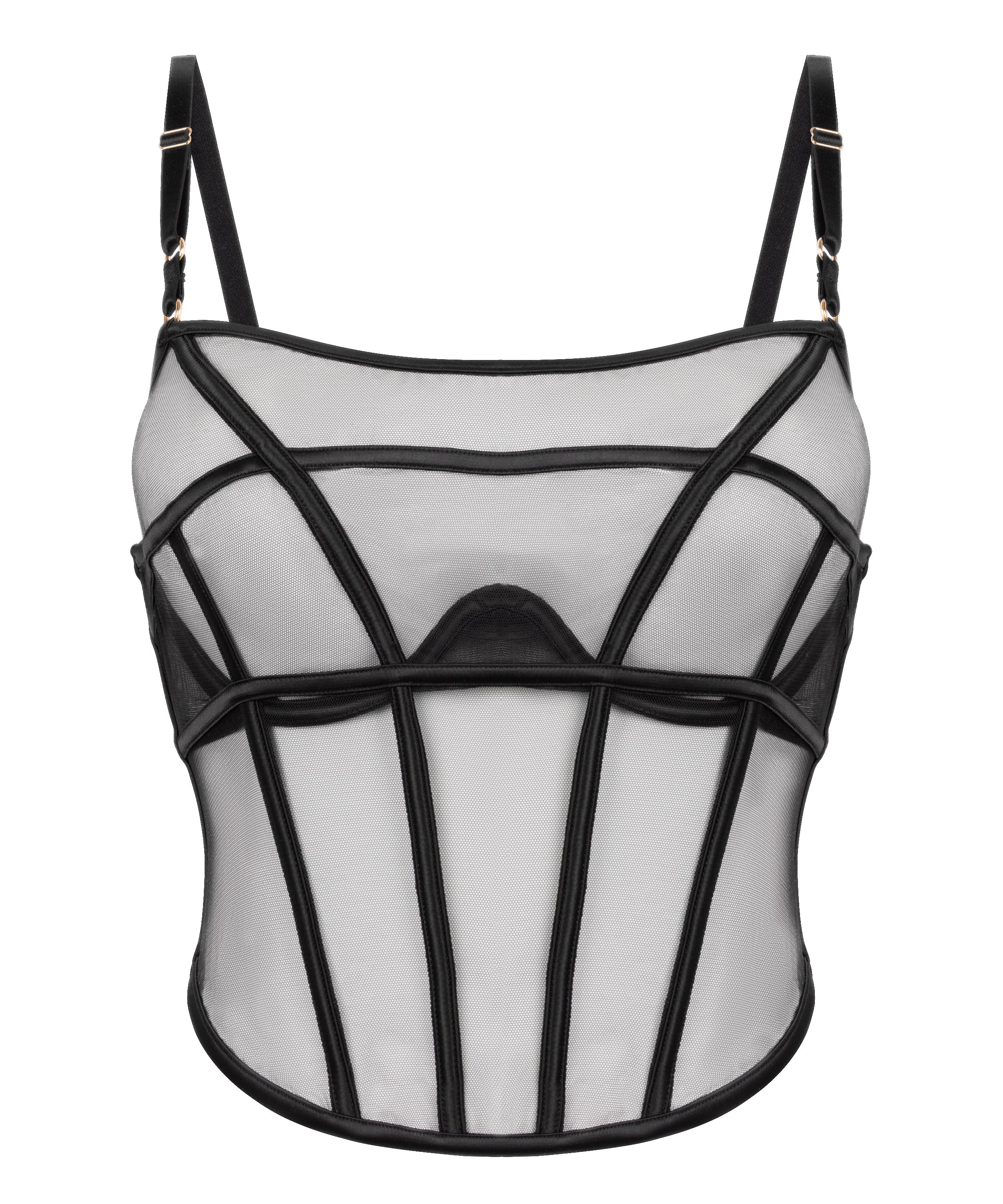Este corpiño está diseñado para esculpir y seducir; con paneles de malla por toda la prenda, esta pieza combina elegancia y estilo moderno. Las copas con aros proporcionan un soporte estructurado, mientras que las costuras contorneadas realzan tus curvas naturales, Parte de nuestra colección privada.