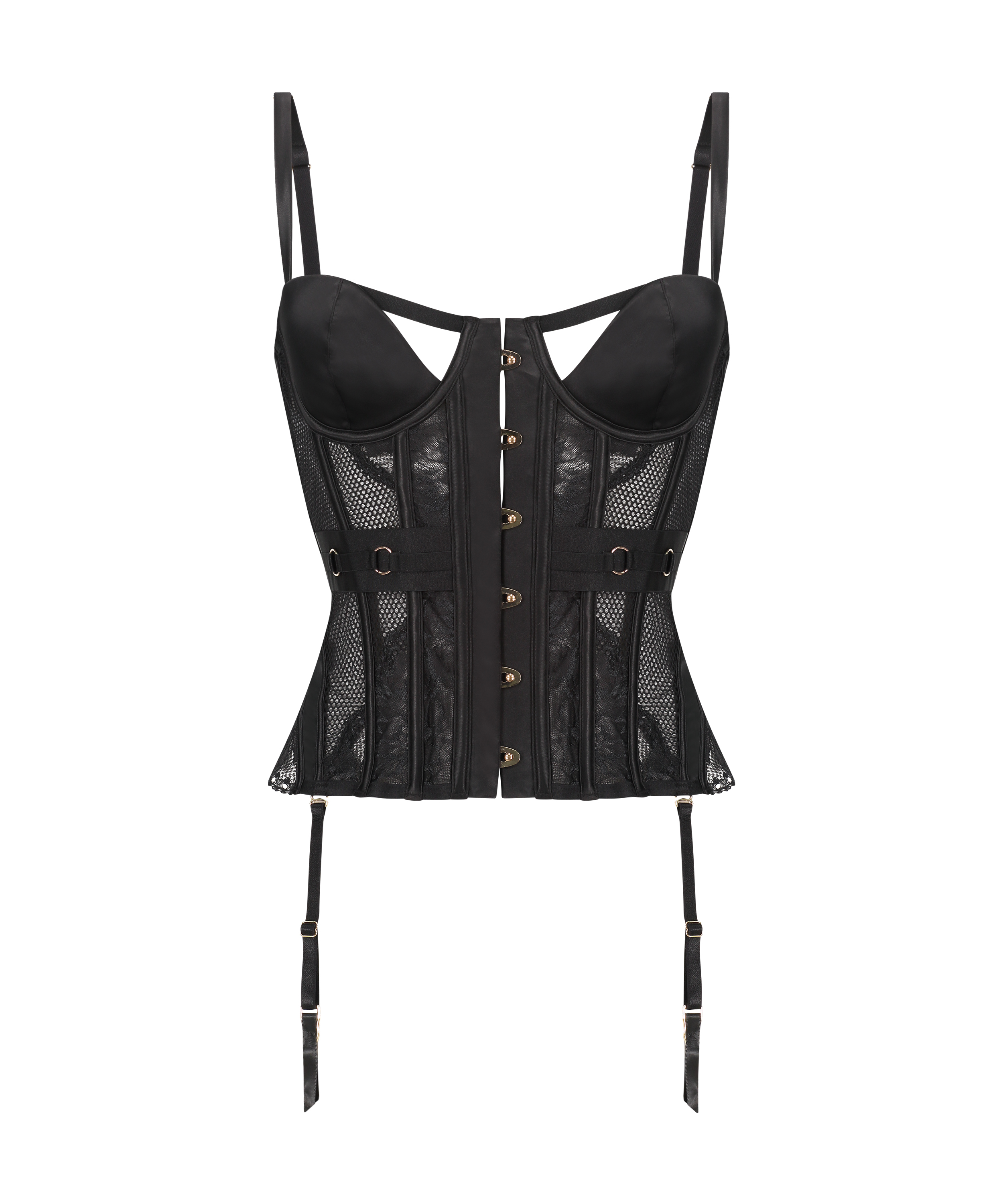 ¡Explora tu poder de seducción con este sexi corpiño! Hecho con material de red transparente y decorado con muchos encajes. Las copas con aros están hechas de un material satinado. Tiene un cierre frontal con herrajes picantes. Las varillas de refuerzo delanteras y traseras hacen que sea cómodo de llevar, y los detalles de tiras alrededor de la cintura ayudan a conseguir un «look» atractivo. Existe la posibilidad de ajustar la espalda con una cuerda de apriete para asegurarte de que se ajusta perfectamente. ¡Encuentra las braguitas a juego y combínalo con medias para completar el conjunto!