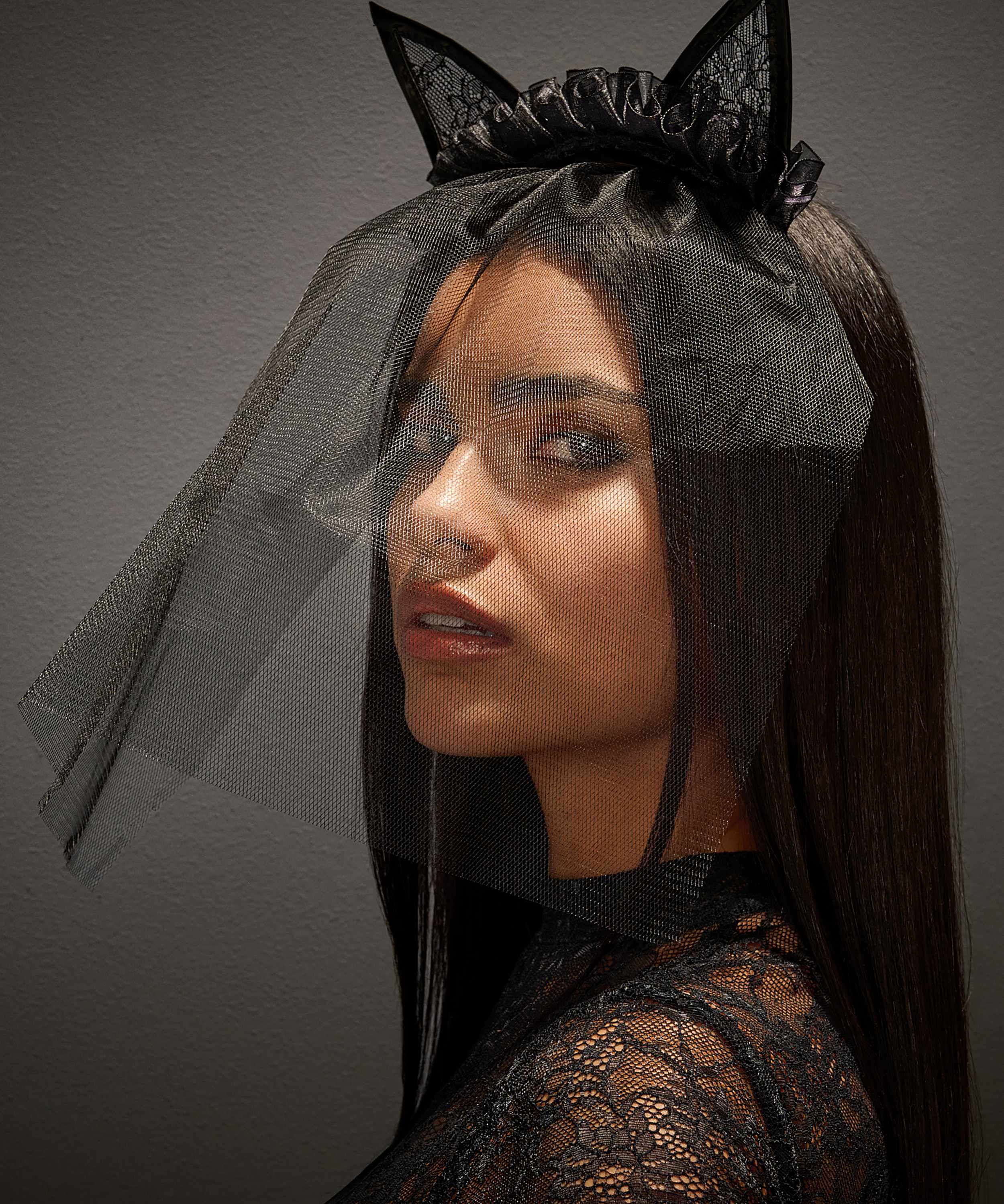 ¿Quieres animar las cosas? ¡Hazte con este conjunto tan sexy de gatita! Tiene una diadema de orejas de gato de encaje con un velo de malla y un arnés de tiras. Forma parte de la colección Private.