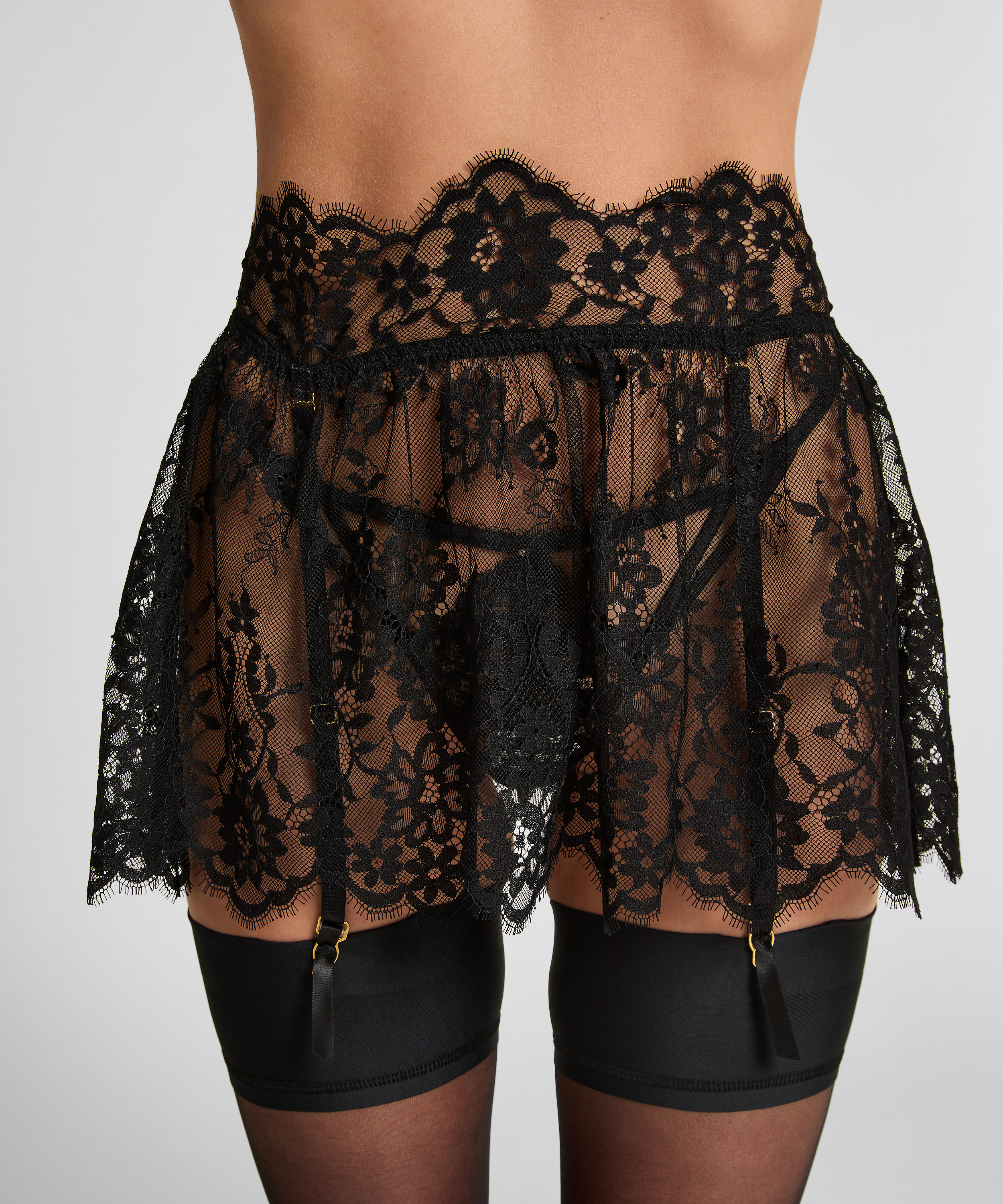 ¡Haz que tu look sea más sexy con este liguero! El liguero es completamente de encaje, tiene una cinturilla elástica y se puede unir a las medias. ¡Combínalo con el top a juego de la colección Private y completa tu look!