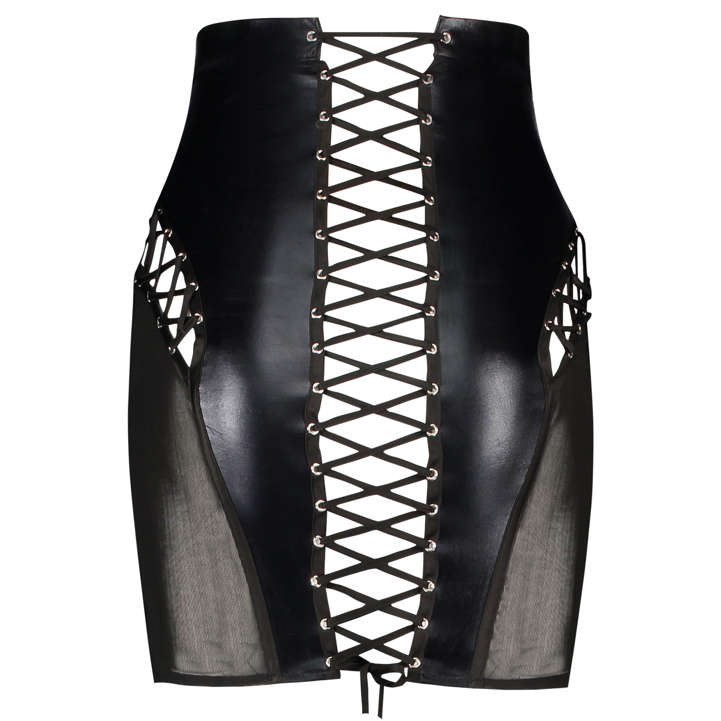¡Esta falda es aterradoramente seductora gracias al acabado de tiras y rejilla! La falda cuenta con un aspecto de cuero sintético como toque final. ¡Forma parte de la seductora colección Private!