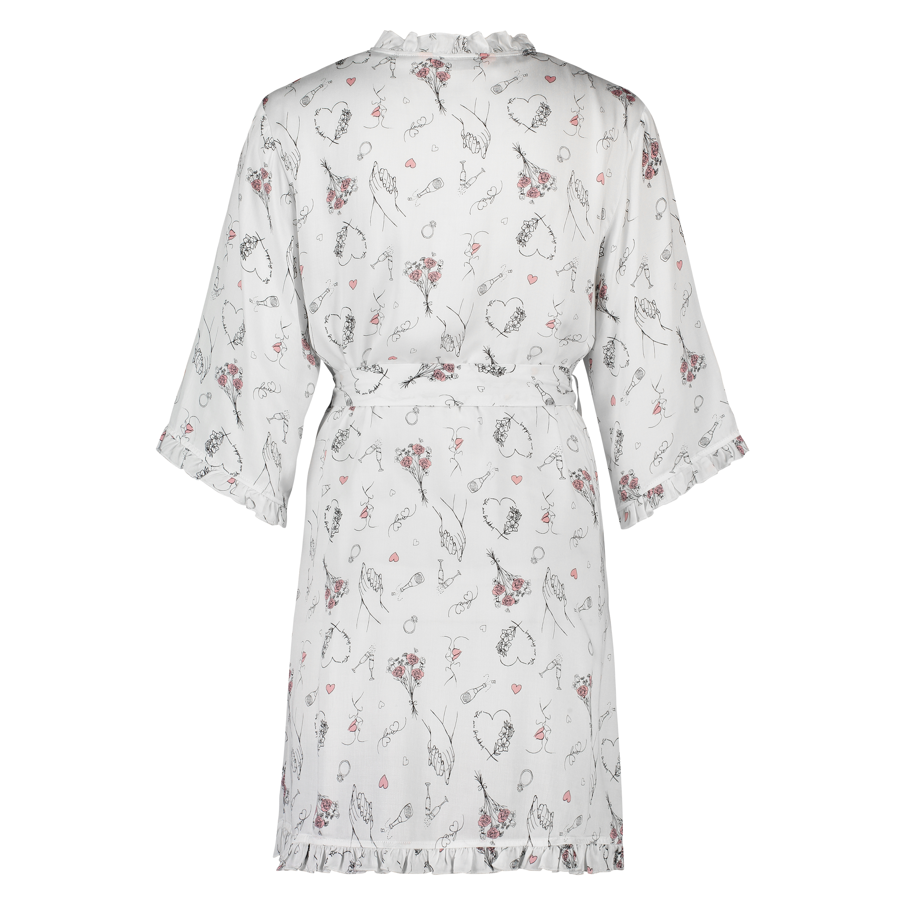 ¡Este kimono es perfecto para todas las futuras novias! ¡El kimono tiene un bonito estampado! Tiene volantes de acabado.