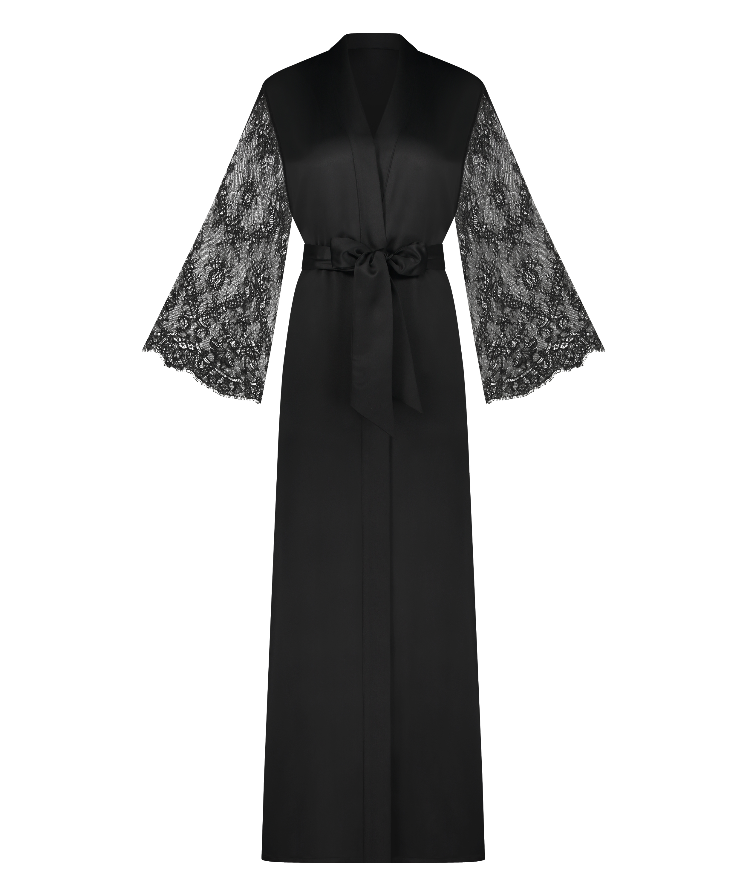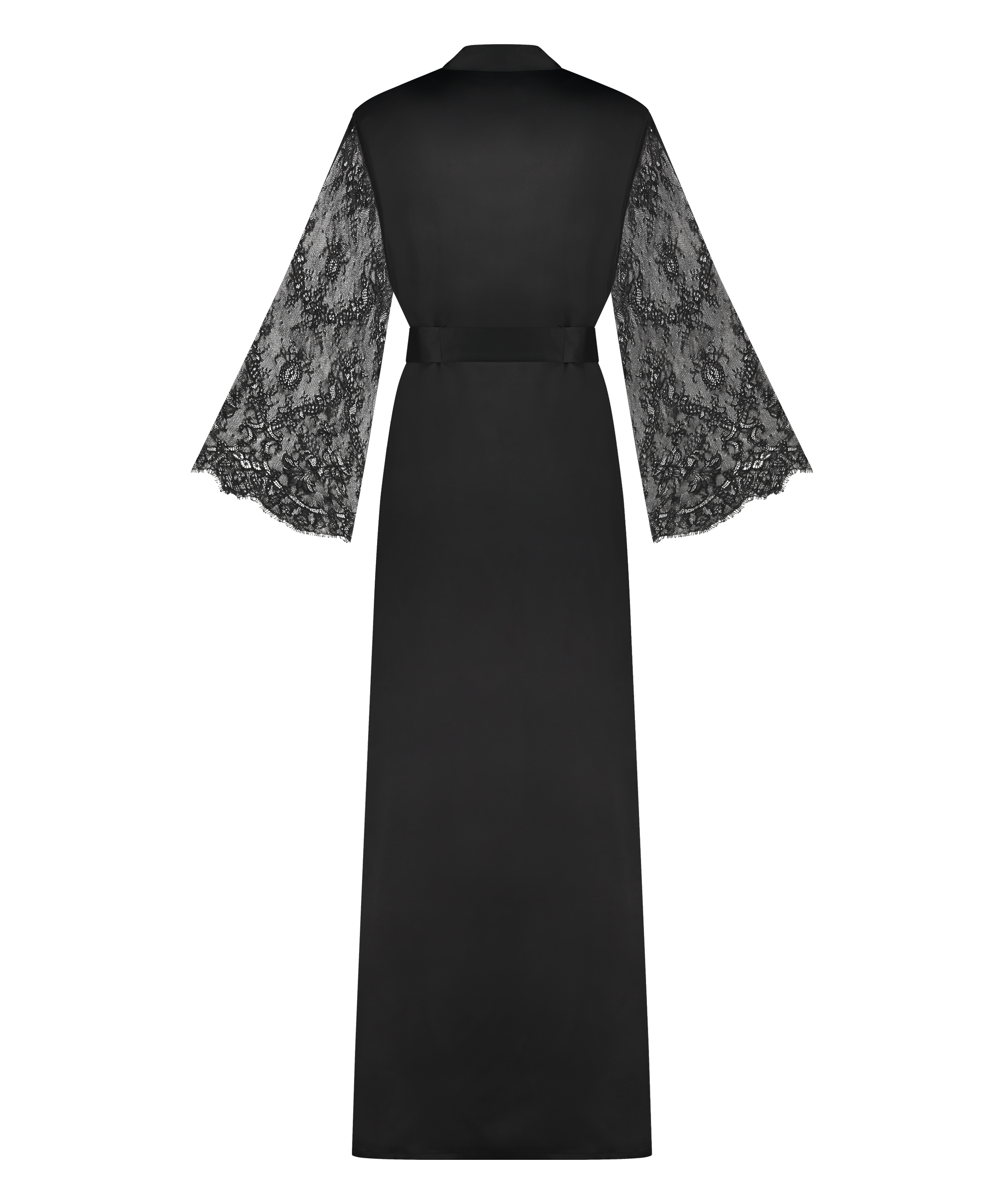 ¡No te pierdas este elegante kimono! Con mucho encaje romántico y cierre de lazo real. Este adorable kimono tiene mangas anchas y está hecho de satén, lo que le da un aspecto lujoso. Combínalo con las prendas a juego. Forma parte de nuestra colección Noir.