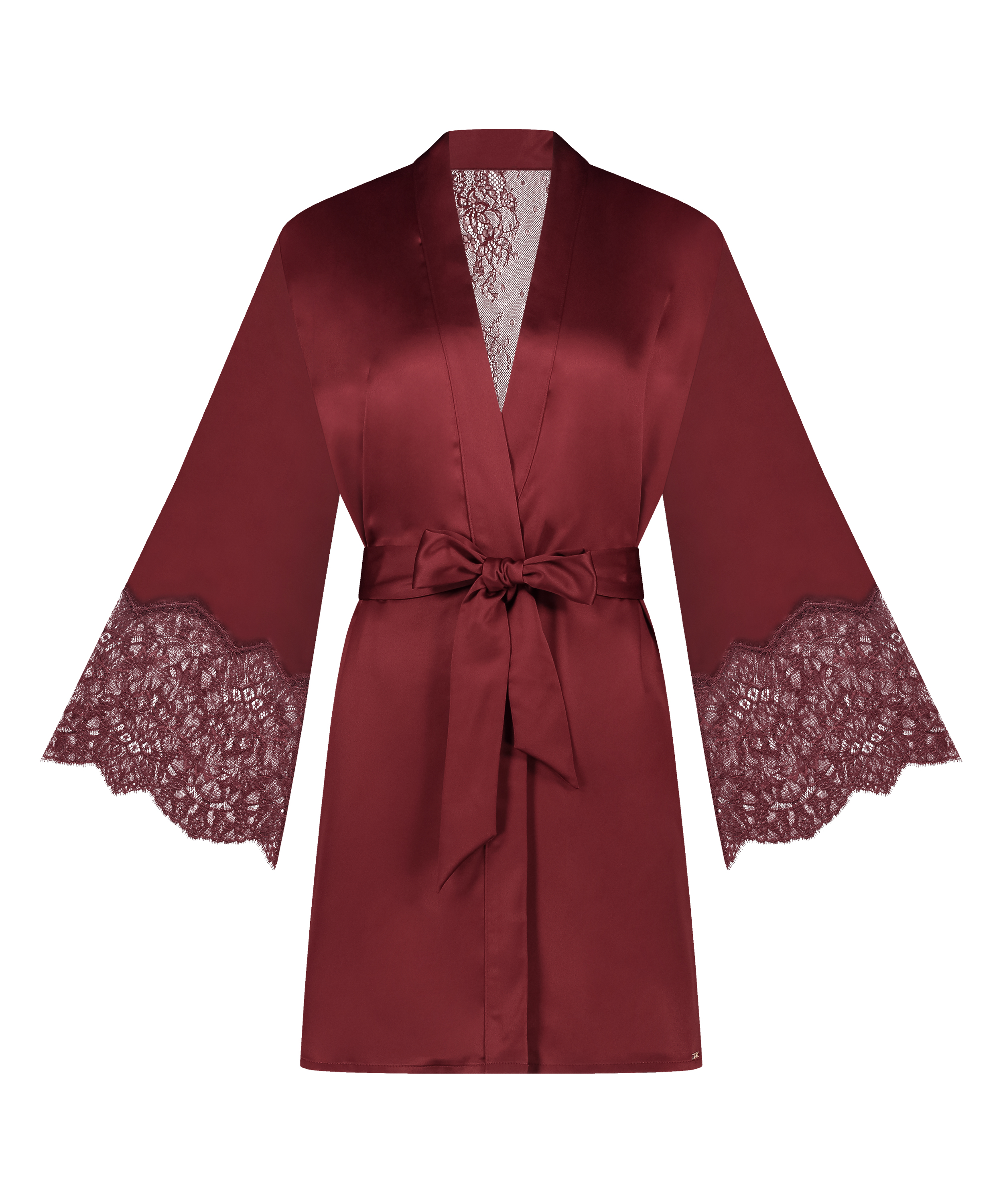 ¡No te pierdas este elegante kimono! Con mucho encaje romántico y cierre de lazo real. Este adorable kimono tiene mangas anchas y está hecho de satén, lo que le da un aspecto lujoso. Combínalo con las prendas a juego. Forma parte de nuestra colección Noir.
