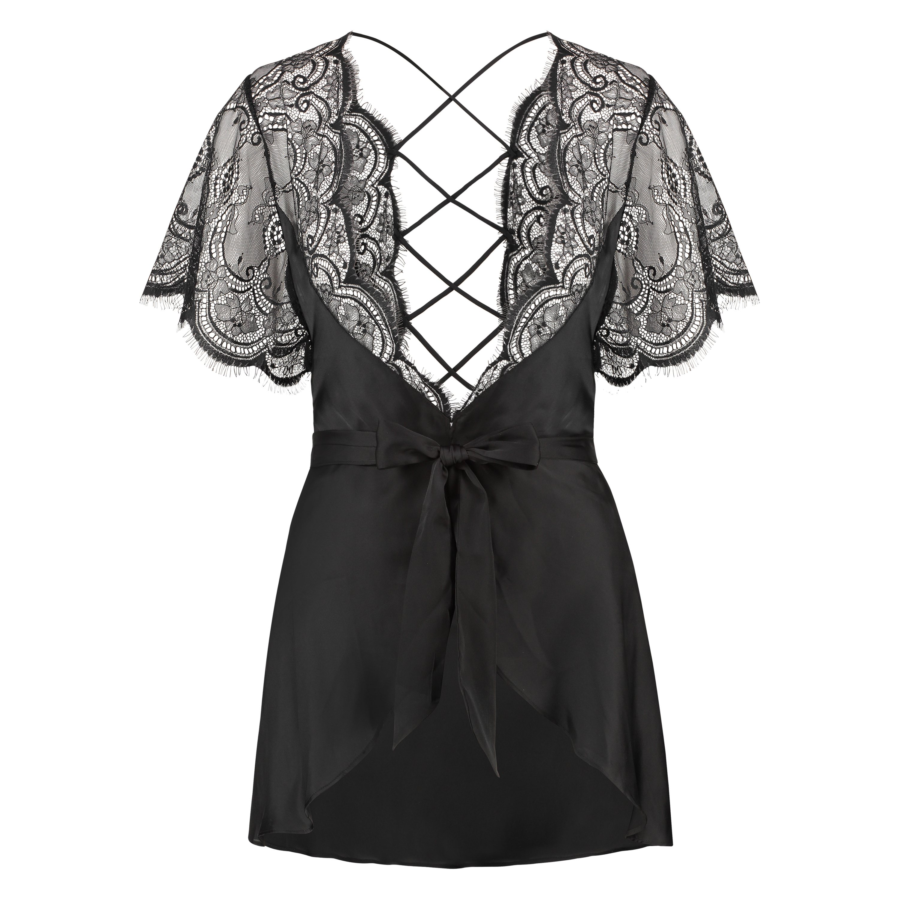 Kimono sexy con encaje semitransparente y malla. Este kimono tiene mangas cortas y una elegante espalda cerrada. Parte de la Colección Privada.