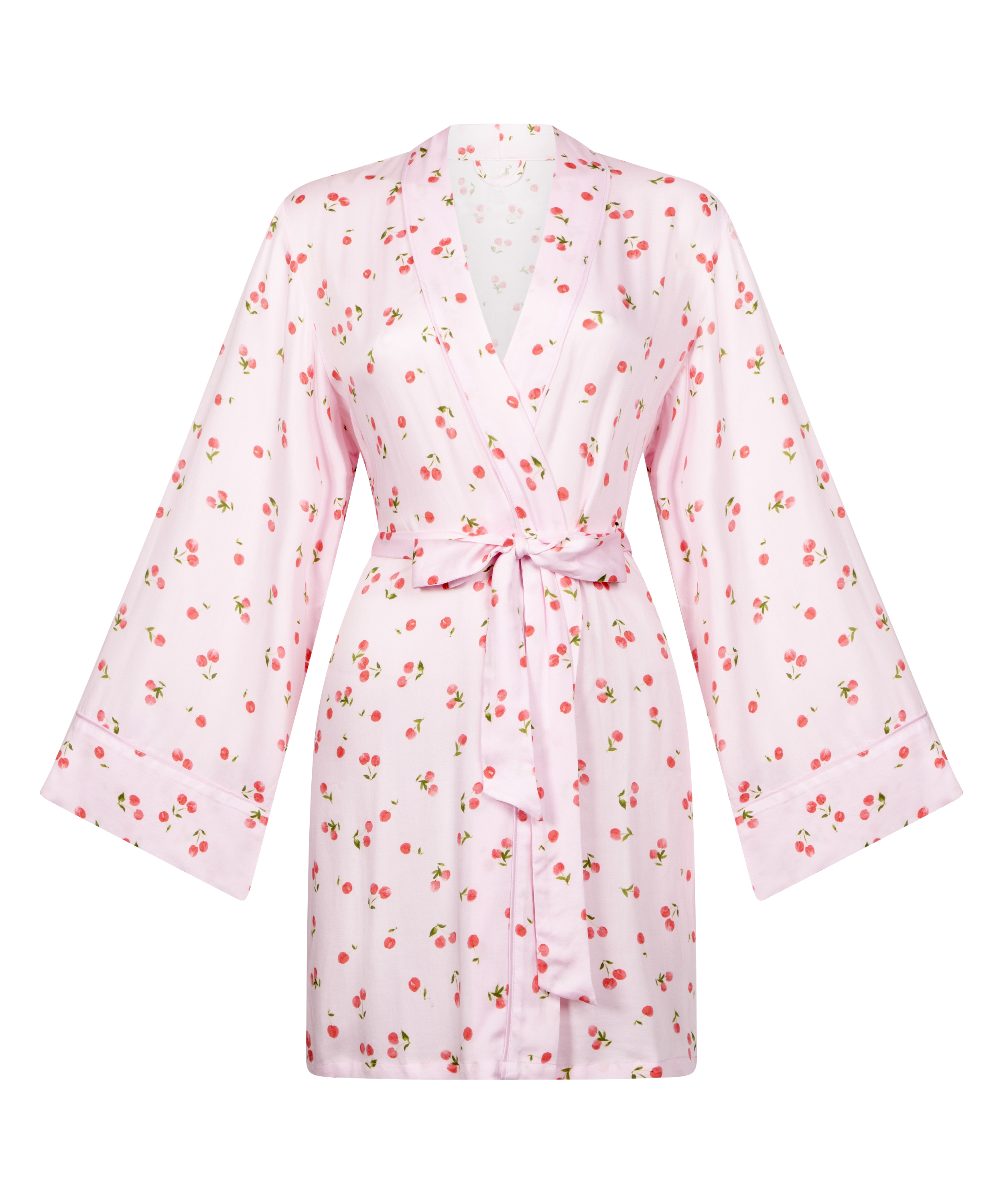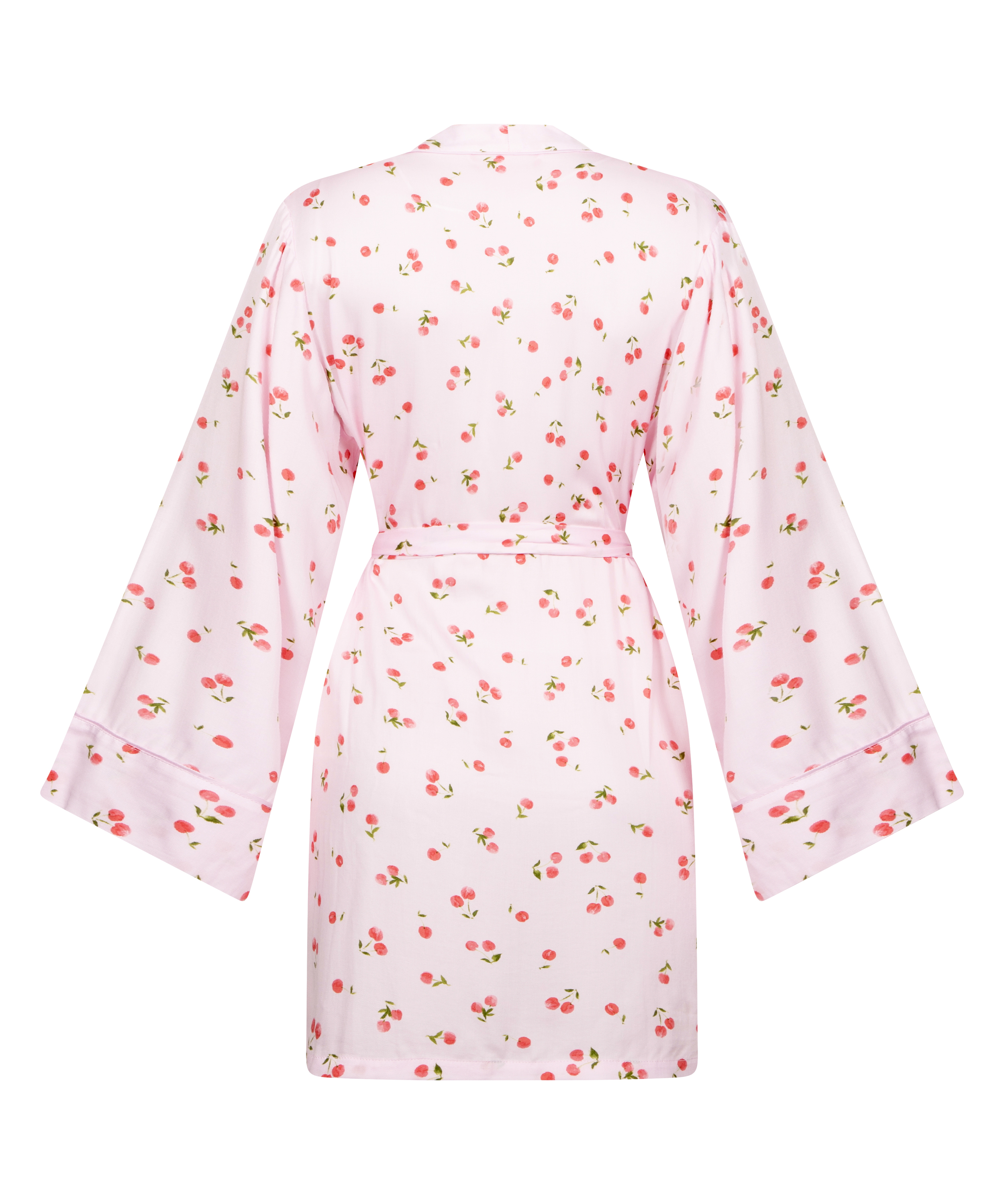 Este kimono está elaborado de un precioso tejido satinado. El kimono se puede abrochar por la parte delantera con nudo.